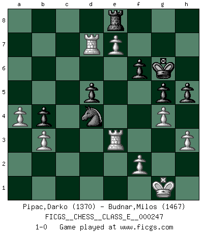 Last move : 1-0 2024 January 8 18:22:46 [Event "FICGS__CHESS__CLASS_E__000247"] [Site "FICGS"] [Date "2023.12.04"] [Round "1"] [White "Pipac,Darko"] [Black "Budnar,Milos"] [Result "1-0"] [WhiteElo "1370"] [BlackElo "1467"] 1.e4 e5 2.Nf3 Nf6 3.d3 h6 4.Nxe5 d6 5.Nf3 Be7 6.h3 O-O 7.Nc3 c6 8.d4 d5 9.e5 Ne4 10.Bd2 Nxd2 11.Qxd2 Bb4 12.a3 Bxc3 13.Qxc3 Bf5 14.Bd3 Bxd3 15.Qxd3 Nd7 16.O-O f6 17.e6 Nb6 18.Rfe1 Qe7 19.Nh4 Qd6 20.Re2 Qf4 21.Ng6 Qd6 22.Nxf8 Qxf8 23.Qg6 Qe8 24.Qxe8+ Rxe8 25.b3 Nc8 26.c4 a6 27.cxd5 cxd5 28.Rc1 Ne7 29.Rc7 b5 30.Ra7 Nc6 31.Rxa6 Nxd4 32.Re3 g5 33.g4 Kg7 34.a4 b4 35.Ra7+ Kg6 36.e7 h5 37.Rd7 1-0 Follow this game move after move (download)Place the contents of the Chess box in a hat, shake them up vigorously, pour them on the board from a height of two feet, and you get the style of Steinitz. (H. E. Bird) Das typische an einem Großmeister ist, daß er eine gewonnene Position schnell und schmerzlos gewinnt. (Irving Chernev) El Ajedrez era la lengua materna de Capablanca. (Reti) A chaque perte on perd un peu de soi. (Joël Lautier) Don't anthropomorphize computers - they hate it. (Anonymous)