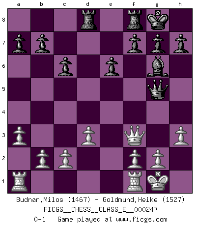 Last move : 0-1 2024 January 31 7:43:5 [Event "FICGS__CHESS__CLASS_E__000247"] [Site "FICGS"] [Date "2023.12.04"] [Round "1"] [White "Budnar,Milos"] [Black "Goldmund,Heike"] [Result "0-1"] [WhiteElo "1467"] [BlackElo "1527"] 1.e4 d5 2.Bd3 dxe4 3.Bxe4 Nf6 4.Nc3 Nxe4 5.Nxe4 c6 6.h3 Bf5 7.Qe2 e6 8.d3 Be7 9.Nf3 O-O 10.O-O Nd7 11.a3 Nf6 12.Nxf6 Bxf6 13.Ne5 Qd5 14.Nf3 Rad8 15.Bg5 Bxg5 16.Nxg5 Bg6 17.Qf3 Qxg5 0-1 Follow this game move after move (download)The chessboard is the world, the pieces are the phenomena of the Universe, the rules of the game are what we call the laws of Nature and the player on the other side is hidden from us. (Thomas Huxley) Es ist wirklich schade, dass so viele Schachspieler nicht auf ihr Äußeres achten! (Alexandra Kosteniuk) El Ajedrez es un regaderazo frío para la mente. (Sir John Simon) Il vaut mieux sacrifier les pièces de l'adversaire. (Xavier Tartacover) Depression is just anger without enthusiasm. (Unknown)