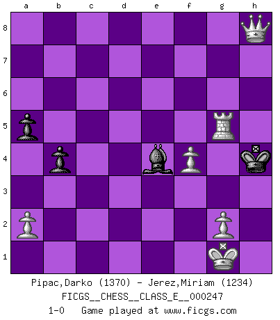 Last move : 1-0 2024 March 15 23:39:43 [Event "FICGS__CHESS__CLASS_E__000247"] [Site "FICGS"] [Date "2023.12.04"] [Round "1"] [White "Pipac,Darko"] [Black "Jerez,Miriam"] [Result "1-0"] [WhiteElo "1370"] [BlackElo "1234"] 1.e4 e5 2.Nf3 Nc6 3.d4 exd4 4.Nxd4 Nge7 5.Nc3 g6 6.Bb5 a6 7.Bxc6 dxc6 8.Bg5 Bg7 9.Bxe7 Qxe7 10.O-O O-O 11.Re1 c5 12.Nf3 Rd8 13.Nd5 Qd6 14.Qd2 Bxb2 15.Rab1 Be5 16.Nxe5 Qxe5 17.Rbd1 Bg4 18.f3 Bc8 19.h4 Qg3 20.Nf6+ Kg7 21.Qxd8 Qe5 22.Qg8+ Kxf6 23.Qh8+ Ke6 24.Qxe5+ Kxe5 25.Rd8 b5 26.Red1 a5 27.R1d5+ Kf4 28.Rxc5 b4 29.Rxc7 Bb7 30.Rxa8 Bxa8 31.Rxf7+ Kg3 32.Rxh7 Bc6 33.Rg7 Be8 34.h5 g5 35.h6 Ba4 36.Rxg5+ Kh4 37.f4 Bxc2 38.h7 Bxe4 39.h8Q+ 1-0 Follow this game move after move (download)Those who say they understand Chess, understand nothing. (Robert Hubner) Herr Iljumschinow ist ein etwas merkwürdiger Geschäftsmann: Er arbeitet zusammen mit Leuten wie Muammar al-Gaddafi; früher ist das Saddam Hussein gewesen. (Joel Lautier) Botvinnik trató de alejar el misterio referente al Ajedrez, siempre relacionandolo a situaciones de la vida diaria. Solía llamar al Ajedrez un problema inexacto típico, similar a aquellos en que la gente tiene siempre que resolver a cada día. (Garry Kasparov) On est toujours la mazette de quelqu'un d'autre. (Anonyme) Everything in life is luck. (Donald Trump)