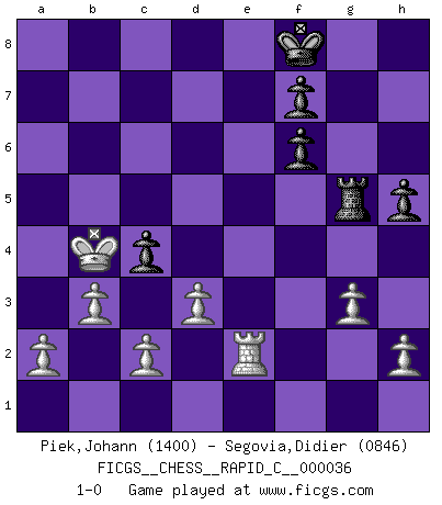 Last move : 1-0 2007 December 29 10:4:26 [Event "FICGS__CHESS__RAPID_C__000036"] [Site "FICGS"] [Date "2007.09.10"] [Round "1"] [White "Piek,Johann"] [Black "Segovia,Didier"] [Result "1-0"] [WhiteElo "1400"] [BlackElo "0846"] 1.e4 e5 2.f4 d5 3.exd5 Qxd5 4.Nc3 Qd6 5.Qe2 Nc6 6.Nf3 Bg4 7.fxe5 Bxf3 8.Qxf3 Qxe5+ 9.Kd1 Be7 10.Ba6 Rb8 11.Bxb7 Nd4 12.Bc6+ Nxc6 13.Qxc6+ Kd8 14.Qd5+ Qxd5 15.Nxd5 Nf6 16.Nxe7 Kxe7 17.b3 Rhe8 18.Bb2 Kf8 19.Bxf6 gxf6 20.d3 Re3 21.Kd2 Rbe8 22.Rae1 R3e5 23.Rhf1 Rg5 24.g3 Rxe1 25.Rxe1 Rh5 26.Re2 c5 27.Kc3 a5 28.Kc4 Rg5 29.Kb5 h5 30.Kxa5 c4 31.Kb4 1-0 This chess game has been lost on time (started : 2007.09.10 23:59:11) KGD : Falkbeer counter-gambit Player White won this chess game. Follow this game move after move (download)I am the best player in the world and I am here to prove it. (Bobby Fischer) Herr Iljumschinow ist ein etwas merkwürdiger Geschäftsmann: Er arbeitet zusammen mit Leuten wie Muammar al-Gaddafi; früher ist das Saddam Hussein gewesen. (Joel Lautier) Vive, pierde y aprende al observar a tu oponente como gana. (Amber Steenbock) Roi des jeux et jeu des rois, les échecs portent en eux un sentiment d'infini. Ils donnent à celui qui s'est efforcé d'en approfondir les arcanes l'impression de n'être pas à la mesure de l'homme; en fait, ils constituent un résumé de l'univers, un microcosme, et figurent cette grande échelle qui, dans les plans de la lumière descend jusqu'à la matière, qui des abîmes insondables remonte jusqu'en l'infini de Dieu. (Pyrame) There are two kinds of tragedy in this world, one is not getting what you want and the other is getting. (Lord of war)