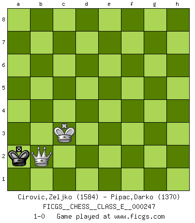 Last move : 1-0 2024 May 7 4:23:30 [Event "FICGS__CHESS__CLASS_E__000247"] [Site "FICGS"] [Date "2023.12.04"] [Round "1"] [White "Cirovic,Zeljko"] [Black "Pipac,Darko"] [Result "1-0"] [WhiteElo "1584"] [BlackElo "1370"] 1.e4 e5 2.d4 exd4 3.c3 dxc3 4.Nxc3 Bb4 5.Qd4 Nc6 6.Qxg7 Qf6 7.Qxf6 Nxf6 8.f3 d5 9.exd5 Nxd5 10.Bd2 Bf5 11.Bb5 Bxc3 12.Bxc3 Nxc3 13.Bxc6+ bxc6 14.bxc3 O-O-O 15.Nh3 Bxh3 16.gxh3 Rhe8+ 17.Kf2 Rd2+ 18.Kg3 R8e2 19.Kg4 Rxh2 20.Rxh2 Rxh2 21.h4 Kd7 22.Rd1+ Ke6 23.Re1+ Kf6 24.Rb1 Rxa2 25.Rb7 Ra4+ 26.f4 h5+ 27.Kxh5 Rxf4 28.Rxa7 Rc4 29.Rxc7 Rxc3 30.Kg4 Ke6 31.h5 f5+ 32.Kf4 Rc4+ 33.Kg3 f4+ 34.Kg4 Kf6 35.h6 Ke6 36.h7 f3 37.Kg3 f2 38.h8Q f1Q 39.Qc8+ Kd5 40.Qd7+ Ke4 41.Qh7+ Kd4 42.Qg7+ Ke3 43.Qe5+ Kd3 44.Rd7+ Kc2 45.Rd6 Rc3+ 46.Kg4 Qh3+ 47.Kg5 Qg2+ 48.Kf5 Qf2+ 49.Kg6 Rg3+ 50.Kh6 Qf8+ 51.Kh5 Rc3 52.Qe4+ Kb2 53.Rd2+ Ka3 54.Rd3 Qc5+ 55.Kg4 Rxd3 56.Qxd3+ Kb4 57.Qb1+ Kc4 58.Kf3 Qd5+ 59.Ke3 c5 60.Qa2+ Kc3 61.Qxd5 c4 62.Qd2+ Kb3 63.Kd4 c3 64.Qxc3+ Ka2 65.Qb4 Ka1 66.Kc3 Ka2 67.Qb2+ 1-0 Follow this game move after move (download)Weak points or holes in the opponent's position must be occupied by pieces not Pawns. (Siegbert Tarrasch) Zu meiner Zeit war ein 20 jähriger ein junger Spieler, heute ist er ein Veteran. (Garry Kasparov) La caracteristica mas importante en la posición del Ajedrez es la actividad de las piezas. Esto es absolutamente fundamental en todas las fases del juego: Apertura, Juego Medio y especialmente Finales. La limitación primordial en la actividad de una pieza, es la estructuración de los Peones. (Michael Stean) Le thème de l'attaque double intervient d'une manière ou d'une autre dans l'immense majorité des combinaisons. (Youri Averbakh) When you stop learning you start dying. (M. Scott Adams)