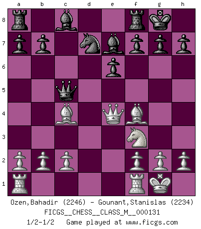 Last move : 1/2-1/2 2024 January 7 9:5:2 [Event "FICGS__CHESS__CLASS_M__000131"] [Site "FICGS"] [Date "2023.12.12"] [Round "1"] [White "Ozen,Bahadir"] [Black "Gounant,Stanislas"] [Result "1/2-1/2"] [WhiteElo "2246"] [BlackElo "2234"] 1.d4 e6 2.e4 d5 3.Nd2 c5 4.Ngf3 Nf6 5.exd5 Qxd5 6.Bc4 Qd6 7.dxc5 Qxc5 8.Qe2 Be7 9.O-O O-O 10.Ne4 Nxe4 11.Qxe4 Nd7 12.Be3 Qc7 13.Bf4 Qc5 14.Be3 Qc7 15.Bf4 Qc5 1/2-1/2 Follow this game move after move (download)The defensive power of a pinned piece is only imaginary. (Aaron Nimzovich) Die FIDE ist dabei in die Hände der russischen Mafia zu fallen. (Larry Evans) Cuando no sepas que mover, espera por una idea que se le venga a la la cabeza de tu oponente. Tenlo por seguro de que esa idea estará incorrecta. (Siegbert Tarrasch) Les Echecs, c'est l'art de la guerre sans les charniers, c'est la résurrection des morts tombés au champ d'honneur, l'espoir perpétuel, la suprématie de l'intelligence sur la force, la culture de l'esprit. (F. Szpiner) Lamb in skin of tiger, still fears the wolf. (Chinese proverb)