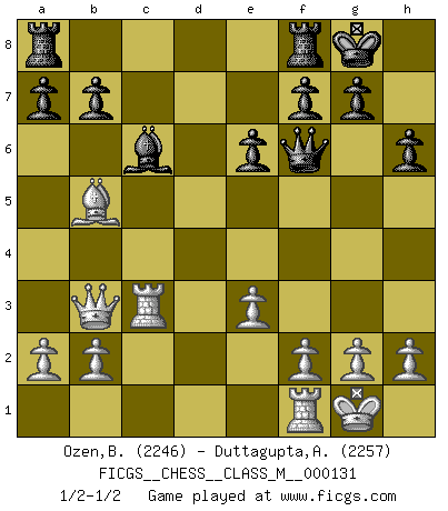 Last move : 1/2-1/2 2024 February 15 11:36:44 [Event "FICGS__CHESS__CLASS_M__000131"] [Site "FICGS"] [Date "2023.12.12"] [Round "1"] [White "Ozen,Bahadir"] [Black "Duttagupta,Aniruddha"] [Result "1/2-1/2"] [WhiteElo "2246"] [BlackElo "2257"] 1.d4 Nf6 2.c4 e6 3.Nf3 d5 4.Nc3 Bb4 5.Bg5 h6 6.Bxf6 Qxf6 7.e3 O-O 8.Rc1 dxc4 9.Bxc4 c5 10.O-O cxd4 11.Nxd4 Bd7 12.Qb3 Nc6 13.Nxc6 Bxc3 14.Rxc3 Bxc6 15.Bb5 Bd5 16.Bc4 Bc6 17.Bb5 1/2-1/2 Follow this game move after move (download)Winning isn't everything... but losing is nothing. (Mednis) Besser ein falscher Plan, logisch durchgeführt, als gar kein Plan. (Viktor Kortschnoi) Es muy difícil jugar en contra de la teoría de Einstein. - en su primera derrota en contra de Fischer (Mikhail Tal) Il (Jacob Murray) ne joue pas pour le bon coup, mais pour le meilleur. (Eloi Relange) Two beer, or not two beer. (Unknown)
