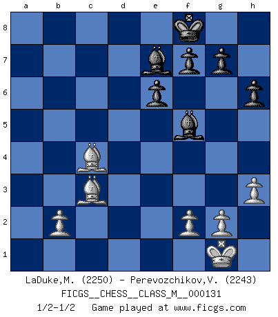 Last move : 1/2-1/2 2024 February 6 19:12:52 [Event "FICGS__CHESS__CLASS_M__000131"] [Site "FICGS"] [Date "2023.12.12"] [Round "1"] [White "LaDuke,Matt"] [Black "Perevozchikov,Vjacheslav"] [Result "1/2-1/2"] [WhiteElo "2250"] [BlackElo "2243"] 1.d4 d5 2.Nf3 c6 3.Bf4 Nf6 4.e3 Bf5 5.c4 Qb6 6.Qc1 Nbd7 7.Nc3 e6 8.h3 c5 9.a4 a6 10.a5 Qd8 11.Qd1 cxd4 12.exd4 dxc4 13.Bxc4 Bb4 14.Qa4 Qe7 15.O-O O-O 16.Qb3 Rfc8 17.Rfc1 Bd6 18.Ne5 Ne4 19.Nxe4 Bxe4 20.Qe3 Bf5 21.Nxd7 Qxd7 22.Be2 Bb4 23.Qb3 Qxd4 24.Be3 Rxc1+ 25.Rxc1 Qd6 26.Rc4 Bxa5 27.Qxb7 Rb8 28.Rc8+ Rxc8 29.Qxc8+ Qf8 30.Qxa6 Bb4 31.Qc4 h6 32.Bd4 Qd6 33.Bh5 Ba5 34.Qc8+ Qd8 35.Qxd8+ Bxd8 36.Be2 Be7 37.Bc4 Kf8 38.Bc3 1/2-1/2 Follow this game move after move (download)Many Chess players were surprised when after the game, Fischer quietly explained: 'I had already analyzed this possibility' in a position which I thought was not possible to foresee from the opening. (Mikhail Tal) Wie kann ich Remis annehmen? Ich weiß ja gar nicht, wie ich stehe! (Fritz Sämisch) Yo creo que el Ajedrez posee una magia que es también una ayuda en la edad avanzada. Una rodilla reumática es olvidada durante una partida de Ajedrez y otros eventos pueden parecer algo sin importancia comparada a una catástrofe en el tablero de Ajedrez. (Vlastimil Hort) Le joueur d'Echecs qui veut atteindre le top est obligé de développer son propre credo créatif. Alexeï Stepanovicth Souétine. Il est facile d'écrire des livres ! Ce qui est difficile, c'est de jouer ! (Alexeï Stepanovicth Souétine) A government big enough to give you everything you want is strong enough to take everything you have. (Thomas Jefferson)