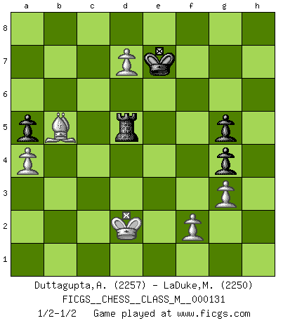 Last move : 1/2-1/2 2024 May 11 9:3:37 [Event "FICGS__CHESS__CLASS_M__000131"] [Site "FICGS"] [Date "2023.12.12"] [Round "1"] [White "Duttagupta,Aniruddha"] [Black "LaDuke,Matt"] [Result "1/2-1/2"] [WhiteElo "2257"] [BlackElo "2250"] 1.Nf3 d5 2.d4 Nf6 3.c4 e6 4.Nc3 Bb4 5.cxd5 exd5 6.Bf4 Ne4 7.Rc1 Nc6 8.Nd2 g5 9.Be3 Nxc3 10.bxc3 Ba3 11.Rb1 f5 12.g3 Bd6 13.Nf3 f4 14.Bc1 O-O 15.Rb5 g4 16.Nh4 Ne7 17.Rb2 Qe8 18.Bg2 Qh5 19.O-O Kg7 20.c4 dxc4 21.Re1 Ng6 22.Nxg6 hxg6 23.e4 a5 24.e5 Bb4 25.Bxf4 g5 26.Bc1 Be6 27.d5 Rad8 28.Rd2 c3 29.Rd3 c2 30.Qe2 Bxe1 31.Qxe1 c6 32.d6 Rh8 33.Qd2 Qxh2+ 34.Kf1 Qh6 35.Be4 Rdf8 36.d7 Bd5 37.Rxd5 cxd5 38.Bg2 Rf5 39.Qxc2 Rxe5 40.Qc3 Qd6 41.Bb2 d4 42.Qxd4 Qxd4 43.Bxd4 Kf6 44.Bb6 Ke7 45.Bd4 Ke6 46.Bxb7 Rf8 47.Bxe5 Kxe5 48.Bc6 Kd6 49.Bb5 Ke7 50.a4 Rf5 51.Ke2 Re5+ 52.Kd2 Rd5+ 1/2-1/2 Follow this game move after move (download)When the Chess game is over, the Pawn and the King go back to the same box. (Irish saying) Je mehr wir mit Computern analysieren, desto mehr glauben wir an Verteidigung. (Vladimir Kramnik) Personalmente, yo prefiero mirar hacia el futuro en donde un programa de computadora gane el título mundial de Ajedrez. La humanidad necesita una lección de humildad. (Richard Dawkings) Plusieurs personnes se sont demandées comment Tal faisait pour gagner... En fait, c'est très simple ! Il met ses pièces au centre de l'échiquier et les sacrifie quelque part ! (David Bronstein) Vladimir Ras-Putin is still alive... He is also a good actor, I saw him in the Lord of the Rings. (Rodolfo d'Ettorre)