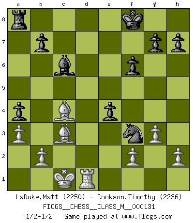 Last move : 1/2-1/2 2024 February 27 22:47:46 [Event "FICGS__CHESS__CLASS_M__000131"] [Site "FICGS"] [Date "2023.12.12"] [Round "1"] [White "LaDuke,Matt"] [Black "Cookson,Timothy"] [Result "1/2-1/2"] [WhiteElo "2250"] [BlackElo "2236"] 1.c4 e5 2.Nf3 e4 3.Nd4 Nc6 4.e3 Nf6 5.Nc3 Bb4 6.Qb3 Nxd4 7.exd4 a5 8.a3 Bxc3 9.dxc3 a4 10.Qb5 O-O 11.Qg5 d5 12.cxd5 Nxd5 13.Qxd8 Rxd8 14.Bd2 c6 15.c4 Ne7 16.Bc3 Be6 17.O-O-O Nf5 18.Be2 Nh4 19.Rhg1 f6 20.d5 cxd5 21.cxd5 Rxd5 22.Rxd5 Bxd5 23.g3 Nf3 24.Rd1 Bc6 25.Bc4+ Kf8 1/2-1/2 Follow this game move after move (download)Life is like a game of Chess, changing with each move. (Chinese proverb) Computer sind die einzigen Gegner, die nicht immer eine Ausrede auf Lager haben, wenn sie gegen mich verlieren. (Robert James Fischer) La última cosa en que Fischer estaba interesado era en tonterías, siempre y cuando el Ajedrez estuviera involucrado. (Elie Agur) Echiquier : carré parfait, comme la Jérusalem nouvelle décrite par l'auteur de l'Apocalypse, huit cases sur huit, exaltation du chiffre 4, symbole du cosmos aux quatre horizons... où le noir et le blanc, l'ombre et la lumière, le mal et le bien s'entremêlent et se conjuguent. (Robert Couffignal, Le Gambit du poète) . 'gn is not allowed in chess unless n is an integer between 1 and 8 inclusive, where 1 and 8 are to interpreted as the standard numerals standing for integers in the ordered real-closed field R, with the *canonical* ordering. (As opposed to, say, an integer in the domain Z[2+i*sqrt(5)] or an integer in some exotic Grothendieck topos). (Normajean Yates)