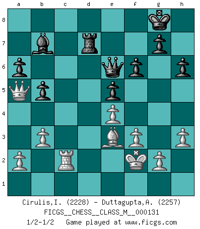 Last move : 1/2-1/2 2024 May 2 11:18:3 [Event "FICGS__CHESS__CLASS_M__000131"] [Site "FICGS"] [Date "2023.12.12"] [Round "1"] [White "Cirulis,Ilmars"] [Black "Duttagupta,Aniruddha"] [Result "1/2-1/2"] [WhiteElo "2228"] [BlackElo "2257"] 1.d4 d5 2.Nf3 Nf6 3.c4 dxc4 4.e3 e6 5.Bxc4 c5 6.O-O a6 7.Be2 cxd4 8.Nxd4 Bc5 9.Nb3 Bd6 10.N1d2 Qc7 11.h3 Nc6 12.Nc4 Bh2+ 13.Kh1 b5 14.Nca5 Nxa5 15.Nxa5 Qxa5 16.Kxh2 Qc7+ 17.Kg1 Bb7 18.Bd2 O-O 19.f3 Qe5 20.Qb3 Rfd8 21.Rfd1 Nh5 22.Bf1 Ng3 23.Qc3 Qb8 24.e4 Nxf1 25.Rxf1 Rd7 26.Be3 Qd8 27.Qc5 Rc8 28.Qb6 Qe8 29.Rac1 Rb8 30.Qa5 Rc8 31.Rxc8 Bxc8 32.Rc1 Bb7 33.Bf4 e5 34.Be3 f6 35.b3 Qe6 36.Kf2 h6 37.Rc2 1/2-1/2 Follow this game move after move (download)In life, as in Chess, one's own Pawns block one's way. A man's very wealth, ease, leisure, children, books, which should help him to win, more often checkmate him. (Charles Buxton) Ihnen, Herr Lasker, habe ich nur drei Worte zu sagen: Schach und matt. (Siegbert Tarrasch) El Ajedrez es tan inspirador que yo no creo que un buen jugador sea capaz de tener un pensamiento malo durante una partida. (Wilhelm Steinitz) Pour se monter efficace, un Cavalier a besoin d'avant-postes ! Les Cavaliers font les meilleurs bloqueurs de pions passés. The various flowers seem good to different people. (Chinese proverb)