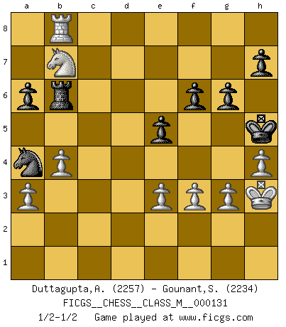 Last move : 1/2-1/2 2024 May 21 9:10:21 [Event "FICGS__CHESS__CLASS_M__000131"] [Site "FICGS"] [Date "2023.12.12"] [Round "1"] [White "Duttagupta,Aniruddha"] [Black "Gounant,Stanislas"] [Result "1/2-1/2"] [WhiteElo "2257"] [BlackElo "2234"] 1.Nf3 d5 2.g3 Nf6 3.Bg2 c6 4.c4 Bg4 5.Ne5 Be6 6.cxd5 Bxd5 7.Nf3 c5 8.Nc3 Bc6 9.O-O e6 10.Qc2 Bd6 11.Rd1 O-O 12.d4 cxd4 13.Nxd4 Bxg2 14.Kxg2 Qb6 15.Be3 Nbd7 16.Nf3 Qa6 17.Qb3 Bc5 18.Bxc5 Nxc5 19.Qb5 Qxb5 20.Nxb5 Nce4 21.Rac1 a6 22.Na3 Rac8 23.Ne5 Nd5 24.Nac4 f6 25.Nd7 Rfd8 26.Ndb6 Nxb6 27.Nxb6 Rxc1 28.Rxd8+ Kf7 29.f3 Rc6 30.Nc8 Nc5 31.b4 Na4 32.Nd6+ Ke7 33.Nxb7 Rb6 34.Rg8 Kf7 35.Rb8 Kg6 36.a3 Kg5 37.h4+ Kh5 38.Kh3 e5 39.e3 g6 1/2-1/2 Follow this game move after move (download)One doesn't have to play well, it's enough to play better than your opponent. (Siegbert Tarrasch) Ein Gewinn durch eine ungenaue Kombination, sei sie auch noch so vorzeigbar, erfüllt mich mit Schaudern. (Wilhelm Steinitz) Solo los afeminados hacen el Enroque. (Rob Sillars) Celui qui prend des risques peut perdre, celui qui n'en prend pas perd toujours. (Xavier Tartacover) Somewhere in the world there is an epigram for every dilemma. (Hendrik Willem van Loon)