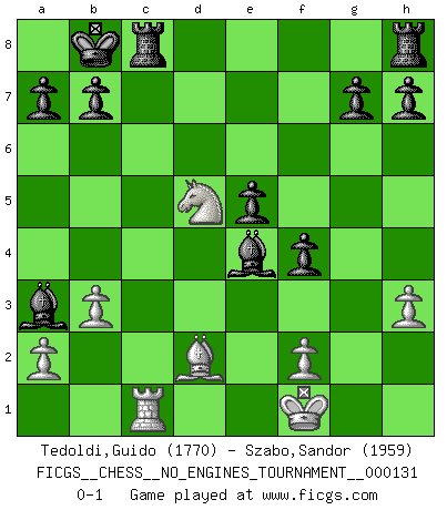 Last move : 0-1 2024 April 22 9:53:20 [Event "FICGS__CHESS__NO_ENGINES_TOURNAMENT__000131"] [Site "FICGS"] [Date "2023.12.17"] [Round "1"] [White "Tedoldi,Guido"] [Black "Szabo,Sandor"] [Result "0-1"] [WhiteElo "1770"] [BlackElo "1959"] 1.c4 Nf6 2.Nc3 d5 3.cxd5 Nxd5 4.e4 Nb4 5.d4 Qxd4 6.Be3 Qxd1+ 7.Kxd1 e5 8.h3 Be6 9.b3 f5 10.Nf3 f4 11.Bd2 N8c6 12.Bb5 O-O-O 13.Bxc6 Nxc6 14.Ke2 Bf7 15.Rhd1 Bh5 16.Nd5 Nd4+ 17.Kf1 Nxf3 18.gxf3 Bxf3 19.Rdc1 Bxe4 20.Rxc7+ Kb8 21.Rac1 Ba3 22.Rc8+ Rxc8 0-1 Follow this game move after move (download)When your house is on fire, you can't be bothered with the neighbors. Or, as we say in Chess, if your King is under attack you don't worry about losing a Pawn on the Queen's side. (Gary Kasparov) Wer nie einen Fehler gemacht hat, hat nie etwas Neues ausprobiert. (Albert Einstein) Mi estilo es algo parecido entre un poco de Tal y Petrosian. (Reshevsky) Les échecs sont un jeu par leur forme, un art par leur essence et une science par sa difficulté d'acquisition. Ils peuvent vous procurer autant de plaisir qu'un bon livre ou une belle musique, mais vous n'aurez une réelle joie que si vous arrivez à bien jouer. (Tigran Petrosian) Wikichess, chess moves explained by 'experimented' players. (Thibault de Vassal)