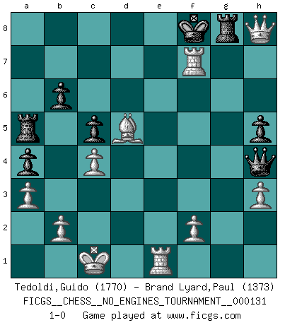 Last move : 1-0 2024 April 2 13:55:45 [Event "FICGS__CHESS__NO_ENGINES_TOURNAMENT__000131"] [Site "FICGS"] [Date "2023.12.17"] [Round "1"] [White "Tedoldi,Guido"] [Black "Brand Lyard,Paul"] [Result "1-0"] [WhiteElo "1770"] [BlackElo "1373"] 1.c4 Nc6 2.Nf3 d6 3.d4 Bg4 4.h3 Bxf3 5.gxf3 Nf6 6.e4 e5 7.d5 Nd4 8.Be3 g6 9.Bxd4 exd4 10.Qxd4 c5 11.Qc3 b6 12.Nd2 Bg7 13.Bg2 Rg8 14.Qc2 Bh6 15.O-O-O Bxd2+ 16.Qxd2 h5 17.Rhe1 a5 18.e5 dxe5 19.Rxe5+ Kf8 20.Rde1 Kg7 21.f4 a4 22.a3 Ra5 23.f5 gxf5 24.Rxf5 Kf8 25.Qh6+ Rg7 26.Bf3 Nxd5 27.Bxd5 Qh4 28.Qh8+ Rg8 29.Rxf7+ 1-0 Follow this game move after move (download)I know people who have all the will in the world, but still can't play good Chess. (Bobby Fischer) Meine Liebe ist Schach, Schach, Schach. Ich muss jeden Tag Schach spielen, deshalb fühle ich mich so stark. (Miguel Najdorf) No soy una persona materialista y por eso, no resiento la falta o pérdida del dinero. La ausencia de cosas mundanas carece de importancia. Ya que el Ajedrez es una forma en la que puedo ser tan materialista como yo desee sin tener la necesidad de vender mi alma. (Jamie Walter Adams) On n'a jamais que l'âge auquel on a commence à jouer aux échecs car après on cesse de vieillir. (Capablanca) I think your argument is specious - I think your tie is ugly. (Gregory House to Dr. Foreman, House M.D.)