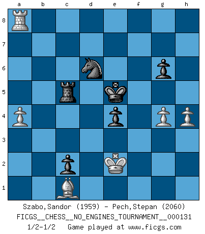 Last move : 1/2-1/2 2024 December 18 0:45:44 [Event "FICGS__CHESS__NO_ENGINES_TOURNAMENT__000131"] [Site "FICGS"] [Date "2023.12.17"] [Round "1"] [White "Szabo,Sandor"] [Black "Pech,Stepan"] [Result "1/2-1/2"] [WhiteElo "1959"] [BlackElo "2060"] 1.d4 Nf6 2.Nc3 d5 3.Bf4 c5 4.e4 Nxe4 5.Nxe4 dxe4 6.dxc5 Qa5+ 7.c3 Qxc5 8.Qa4+ Nc6 9.Qxe4 g6 10.Nf3 Bg7 11.Rd1 Be6 12.Qa4 O-O 13.Be3 Qf5 14.Be2 a6 15.Bd3 Qa5 16.Qxa5 Nxa5 17.Bb1 Nc4 18.Bc1 Rfd8 19.O-O b5 20.Be4 Rac8 21.h3 Nd6 22.Bd5 Bxd5 23.Rxd5 Nc4 24.Rfd1 Rxd5 25.Rxd5 Nb6 26.Rd1 Kf8 27.Kf1 Ke8 28.Be3 Na4 29.Bc1 f5 30.Ng5 h5 31.Ne6 Bf6 32.g3 Kf7 33.Ng5+ Bxg5 34.Bxg5 Nxb2 35.Rd7 Re8 36.Rc7 Nc4 37.h4 Nd6 38.f3 a5 39.Ra7 Ke6 40.Ke2 a4 41.Kf2 Nf7 42.Ra6+ Nd6 43.Ra7 f4 44.Bxf4 Rc8 45.Bd2 b4 46.Rxa4 bxc3 47.Bc1 Kd5 48.Ke3 e5 49.Kd3 Rc5 50.g4 c2 51.Ra8 hxg4 52.fxg4 e4+ 53.Ke2 Kd4 54.Bb2+ Kd5 55.Bc1 Ke5 56.a4 1/2-1/2 Follow this game move after move (download)For me, Chess is life and every game is like a new life. Every Chess player gets to live many lives in one lifetime. (Eduard Gufeld) Wir können eben der zündenden Macht des Opfers nicht wiederstehen, denn die Begeisterung für das Opfer liegt in der Natur des Menschen. (Rudolf Spielmann) No solamente yo pronostico su triunfo sobre Botvinnik, sino que me adelanto y digo que probablemente Fischer es el jugador de Ajedrez mas grande que haya existido. (John Collins) Il n'y a pas eu de défaite parce que je ne crois pas que cet ordinateur ait jamais existé. IBM a triché en refusant d'imprimer les modes de recherche de la machine. C'est évident, pendant le match, des coups décisifs ont été joués par des êtres humains. Aujourd'hui, les meilleurs spécialistes en informatique ne peuvent toujours pas expliquer comment Deep-Blue a pu jouer contre la logique des ordinateurs. IBM a gagné une guerre de communication, mais ils sont incapables de prouver que l'ordinateur a gagné tout seul. (Garry Kasparov) I believe in luck. How else can you explain the success of those you dislike ? (Jean Cocteau)