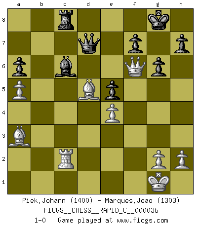 Last move : 1-0 2007 December 7 11:48:16 [Event "FICGS__CHESS__RAPID_C__000036"] [Site "FICGS"] [Date "2007.09.10"] [Round "1"] [White "Piek,Johann"] [Black "Marques,Joao"] [Result "1-0"] [WhiteElo "1400"] [BlackElo "1303"] 1.e4 c5 2.f4 e6 3.Nc3 d6 4.d4 cxd4 5.Qxd4 Nc6 6.Bb5 Qc7 7.Nf3 Nf6 8.O-O Bd7 9.Qf2 Be7 10.Rd1 O-O 11.a3 a6 12.Bc4 b5 13.Ba2 e5 14.Nd5 Nxd5 15.Bxd5 Rac8 16.c4 Na5 17.cxb5 Bxb5 18.b4 Nc4 19.a4 Bd7 20.fxe5 Nxe5 21.Bb2 Bf6 22.Nxe5 dxe5 23.a5 Bb5 24.Rdc1 Qe7 25.Rc5 Rxc5 26.bxc5 Rc8 27.Rc1 Qc7 28.Qg3 Qe7 29.c6 g6 30.Rc2 Qd6 31.Qf3 Bxc6 32.Ba3 Qd7 33.Qxf6 1-0 Sicilian : Grand Prix attack Kingside Castling by player White (move 8) Kingside Castling by player Black (move 10) Player White won this chess game. Follow this game move after move (download)A Chess game is divided into three stages: the first, when you hope you have the advantage, the second when you believe you have an advantage, and the third... when you know you're going to lose ! (Savielly Tartakower) Offener Brief an US-Präsident Bush anlässlich der Verhaftung Bobby Fishers: Verhaften Sie mich. Stecken Sie mich in dieselbe Zelle wie Bobby Fisher und geben Sie uns ein Schachspiel mit. (Boris Vassilievich Spassky) Una partida de Ajedrez se divide en 3 etapas: la primera cuando piensas que tienes la ventaja, la segunda cuando crees que tienes la ventaja y la tercera... ¡cuando te das cuenta que vas a perder!. (Savielly Tartakower) Karpov est une pièce de musée. (Garry Kasparov) How many people work in NATO Headquarters ? - About half of them. (Dirk Stikker, NATO general secretary)
