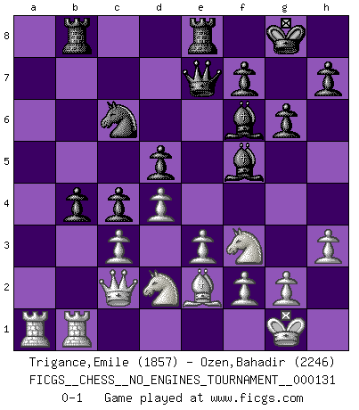 Last move : 0-1 2024 February 25 15:50:51 [Event "FICGS__CHESS__NO_ENGINES_TOURNAMENT__000131"] [Site "FICGS"] [Date "2023.12.17"] [Round "1"] [White "Trigance,Emile"] [Black "Ozen,Bahadir"] [Result "0-1"] [WhiteElo "1857"] [BlackElo "2246"] 1.b4 e5 2.Bb2 Bxb4 3.Bxe5 Nf6 4.c3 Be7 5.e3 c5 6.Bxf6 Bxf6 7.d4 O-O 8.Nd2 Re8 9.Be2 d5 10.Ngf3 Nc6 11.O-O c4 12.Qc2 b5 13.Rab1 Rb8 14.a3 Qe7 15.a4 a6 16.axb5 axb5 17.Ra1 b4 18.Rfb1 g6 19.h3 Bf5 0-1 Follow this game move after move (download)No Chess Grandmaster is normal; they only differ in the extent of their madness. (Viktor Korchnoi) Ja, jede Frau in Holland liebt mich bestimmt, und alle Männer hassen mich. (Loek van Wely) Bobby es el jugador de Ajedrez mas fino que este país jamás haya producido. Su memoria para las movidas, su brillantez en soñar combinaciones y su feróz determinación por la victoria son algo extraño. (John Collins) 'L'échange des dames est un coup dur pour les deux adversaires...' Un journaliste lors d'une partie du match Spassky-Fischer If passion drives you, let reason holds the reins. (Benjamin Franklin)