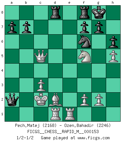 Last move : 1/2-1/2 2024 April 1 3:57:39 [Event "FICGS__CHESS__RAPID_M__000153"] [Site "FICGS"] [Date "2023.12.18"] [Round "1"] [White "Pech,Matej"] [Black "Ozen,Bahadir"] [Result "1/2-1/2"] [WhiteElo "2168"] [BlackElo "2246"] 1.e4 c6 2.d4 d5 3.Nc3 dxe4 4.Nxe4 Bf5 5.Ng3 Bg6 6.h4 h6 7.Nf3 Nd7 8.h5 Bh7 9.Bd3 Bxd3 10.Qxd3 e6 11.Bf4 Qa5+ 12.Bd2 Bb4 13.c3 Be7 14.c4 Qc7 15.O-O-O Ngf6 16.Ne4 Rd8 17.Nxf6+ Nxf6 18.Qe2 c5 19.d5 exd5 20.Rhe1 dxc4 21.Nh4 c3 22.bxc3 O-O 23.Qxe7 Qa5 24.Nf5 Qxa2 25.Qxc5 Qa1+ 26.Kc2 Qa2+ 1/2-1/2 Follow this game move after move (download)Though most people love to look at the games of the great attacking masters, some of the most successful players in history have been the quiet positional players. They slowly grind you down by taking away your space, tying up your pieces, and leaving you with virtually nothing to do ! (Yasser Seirawan) Bis jetzt ist Weiß einer wohlbekannten Analyse gefolgt. Aber jetzt begeht er einen schrecklichen Fehler: Er beginnt seinen eigenen Kopf zu benutzen. (Siegbert Tarrasch) Un mal día en el Ajedrez, es mejor que cualquier buen día en el trabajo. (Anonymous) Vous savez, camarade Pachman, je n'éprouve pas de plaisir à être ministre, je jouerais plutôt aux échecs comme vous, ou alors ferais une révolution au Venezuela. (Che Guevara à Ludek Pachman, 'Checkmate in Prague', 1975) Ah, the Socrating method. The best way we have of teaching everything-apart from juggling chainsaws. (Gregory House, House M.D.)