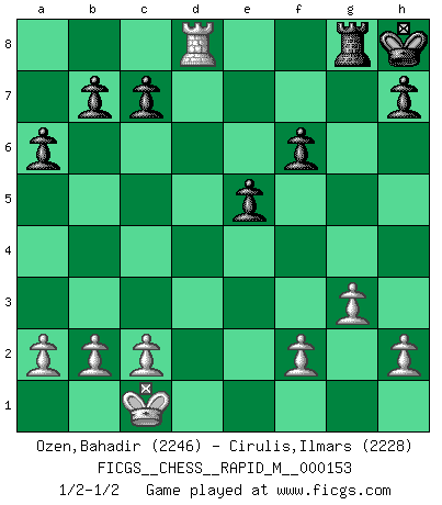 Last move : 1/2-1/2 2024 January 17 15:20:43 [Event "FICGS__CHESS__RAPID_M__000153"] [Site "FICGS"] [Date "2023.12.18"] [Round "1"] [White "Ozen,Bahadir"] [Black "Cirulis,Ilmars"] [Result "1/2-1/2"] [WhiteElo "2246"] [BlackElo "2228"] 1.e4 d6 2.d4 e5 3.Nf3 exd4 4.Nxd4 Nf6 5.Nc3 Be7 6.Bf4 O-O 7.Qd2 Nc6 8.O-O-O Nxd4 9.Qxd4 a6 10.e5 dxe5 11.Qxe5 Bd6 12.Qd4 Bxf4+ 13.Qxf4 Qe7 14.Bc4 Be6 15.Bxe6 fxe6 16.Rhe1 Rad8 17.Rxd8 Rxd8 18.Ne4 e5 19.Nxf6+ gxf6 20.Re3 Qd6 21.Qc4+ Qd5 22.Qg4+ Kh8 23.Rd3 Rg8 24.Rxd5 Rxg4 25.g3 Rg7 26.Rd8+ Rg8 27.Rd7 Rg7 28.Rd8+ Rg8 1/2-1/2 Follow this game move after move (download)When you play Bobby, it is not a question if you win or lose. It is a question if you survive. (Boris Spassky) Versuche, dich von der Sklaverei der Eröffnungsvarianten zu befreien. Stattdessen soll man gewisse Typenpositionen erlernen, die man eingehend analysiert. (Aaron Nimzowitsch) El Ajedrez es como la guerra en un tablero. (Bobby Fischer) Il n'y a plus de joueurs du niveau de Jacob Murray dont la seule quête est le beau jeu, le plaisir de voir les pièces construire quelque chose. Sur 10 idées à la minute, 9 seront sans intérêt, la dernière s'avèrera géniale. (Christian Bauer) A generalist learns less and less about more and more until he knows nothing about everything. (Author unknown)