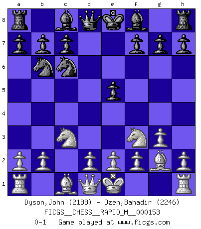 Last move : 0-1 2024 February 6 13:38:12 [Event "FICGS__CHESS__RAPID_M__000153"] [Site "FICGS"] [Date "2023.12.18"] [Round "1"] [White "Dyson,John"] [Black "Ozen,Bahadir"] [Result "0-1"] [WhiteElo "2188"] [BlackElo "2246"] 1.c4 e5 2.g3 Nf6 3.Bg2 d5 4.cxd5 Nxd5 5.Nc3 Nb6 6.Nf3 Nc6 0-1 This chess game has been lost on time (started : 2023.12.18 10:19:41) Follow this game move after move (download)You are for me the Queen on d8 and I am the Pawn on d7 !! (Eduard Gufeld) Der zweitbeste Zug ist oft der einzig richtige. (Savielly Grigorievitsch Tartakower) Yo no creo en la psicología. Yo creo en las buenas movidas. (Bobby Fischer) Si rien de grave n'est détecté lors de l'analyse d'une position, on joue alors le coup. Seconde règle de Blumenfeld. Luck is what you have left over after you give 100 percent. (Langston Coleman)