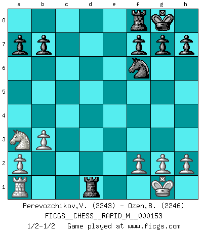 Last move : 1/2-1/2 2024 January 18 9:13:36 [Event "FICGS__CHESS__RAPID_M__000153"] [Site "FICGS"] [Date "2023.12.18"] [Round "1"] [White "Perevozchikov,Vjacheslav"] [Black "Ozen,Bahadir"] [Result "1/2-1/2"] [WhiteElo "2243"] [BlackElo "2246"] 1.Nf3 d5 2.c4 e6 3.e3 Nf6 4.b3 c5 5.cxd5 exd5 6.Be2 d4 7.exd4 cxd4 8.Bb5+ Bd7 9.Nxd4 Bxb5 10.Nxb5 Nc6 11.O-O Be7 12.Bb2 O-O 13.d4 Qd7 14.N5a3 Rad8 15.Nc2 Bc5 16.Nba3 Nxd4 17.Nxd4 Bxd4 18.Bxd4 Qxd4 19.Qxd4 Rxd4 20.Rfd1 Rxd1+ 1/2-1/2 Follow this game move after move (download)I look one move ahead... the best ! (Siegbert Tarrasch) Ich glaube nicht an Psychologie, ich glaube an gute Züge. (Robert James Fischer) No es tiempo de jugar al Ajedrez cuando la casa esta en llamas. (Proverbio Italiano) J'ai vu le vaincu d'Echecs jouer des années durant dans l'espoir de la fête de la victoire. Car tu es plus riche de ce qu'elle existe si même elle n'est point pour toi. Ainsi de la perle du fond des mers. (Antoine de Saint-Exupéry) When it is a question of money, everybody is of the same religion. (Voltaire)