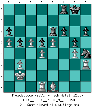 Last move : 1-0 2024 July 2 3:52:3 [Event "FICGS__CHESS__RAPID_M__000153"] [Site "FICGS"] [Date "2023.12.18"] [Round "1"] [White "Maceda,Coco"] [Black "Pech,Matej"] [Result "1-0"] [WhiteElo "2233"] [BlackElo "2168"] 1.c4 e5 2.Nc3 Nf6 3.Qc2 Bb4 4.Nf3 Bxc3 5.Qxc3 d6 6.d4 e4 7.Nd2 O-O 8.h3 Re8 9.e3 d5 10.b3 Nc6 11.a4 Ne7 12.Be2 Ng6 13.Ba3 h6 14.O-O-O Be6 15.Kb2 Rb8 16.Ka1 Qd7 17.Qb4 Rec8 18.Rhg1 b6 19.c5 c6 20.Qc3 b5 21.Bb4 a6 22.a5 Nh4 23.Kb2 Re8 24.Nb1 Bf5 25.Rdf1 Nh7 26.Qe1 Re6 27.Na3 Qe7 28.Qb1 Rf6 29.Qd1 Re8 30.Nc2 Nf8 31.Be1 Nfg6 32.Nb4 Qb7 33.Bg4 Bc8 34.Bd2 Qc7 35.f3 exf3 36.gxf3 Nf5 37.Qe1 Nfh4 38.Qe2 Nf5 39.Qf2 Nfh4 40.Rg3 Qb7 41.Re1 Kh7 42.Bc3 Qa8 43.Reg1 Qb8 44.Be1 Kg8 45.Nd3 Qc7 46.Bc3 Qe7 47.Bd2 Qc7 48.Nb4 Qb7 49.Bc3 Be6 50.Qe2 Bd7 51.Bd2 Qc8 52.e4 dxe4 53.fxe4 Bxg4 54.hxg4 Rfe6 55.Re3 Nf4 56.Qh2 g5 57.Qh1 Qd7 58.Bc3 Qc8 59.Ka2 Qc7 60.Kb1 f6 61.Kb2 Qf7 62.e5 Qd7 63.Rd1 Nd5 64.Nxd5 Qxd5 65.Qxd5 cxd5 66.Rh3 Rf8 67.Be1 1-0 This chess game has been lost on time (started : 2023.12.18 10:19:41) Follow this game move after move (download)Live, lose, and learn, by observing your opponent how to win. (Amber Steenbock) Ich würde die 30 stärksten Spieler der USA im Simultanspiel besiegen. (José Raúl Capablanca) Estaba muy claro de que el punto vulnerable del Gran Maestro Americano (Bobby Fischer) radicaba en las posiciones de doble filo, colgantes, irracionales, donde el siempre falló en encontrar un triunfo aún en una posición de clara victoria. (Efim Geller) A ce moment-là, je menaçais de comprendre la position ! (Clément L'Heureux) Experiences are the keys to life. (Daniel Parmet)