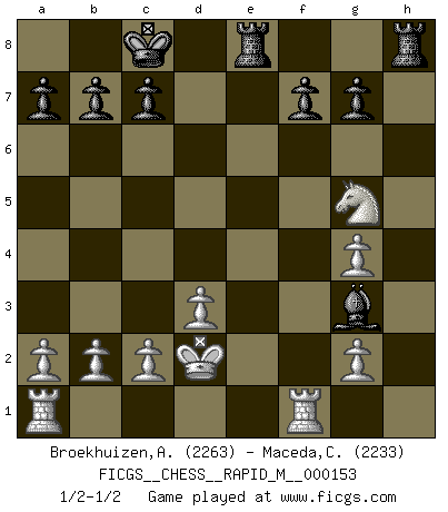 Last move : 1/2-1/2 2024 February 25 4:47:20 [Event "FICGS__CHESS__RAPID_M__000153"] [Site "FICGS"] [Date "2023.12.18"] [Round "1"] [White "Broekhuizen,A. T. S."] [Black "Maceda,Coco"] [Result "1/2-1/2"] [WhiteElo "2263"] [BlackElo "2233"] 1.e4 e5 2.Nf3 Nc6 3.Nc3 Nf6 4.Bb5 Nd4 5.Bc4 Bc5 6.Nxe5 Qe7 7.Nf3 d5 8.Nxd5 Qxe4+ 9.Ne3 Bg4 10.Be2 Nxe2 11.Qxe2 O-O-O 12.d3 Qe6 13.Nxg4 Qxe2+ 14.Kxe2 Nxg4 15.Bg5 Rde8+ 16.Kd2 Bxf2 17.Rhf1 h6 18.h3 Bg3 19.hxg4 hxg5 20.Nxg5 1/2-1/2 Follow this game move after move (download)It was clear to me that the vulnerable point of the American Grandmaster (Bobby Fischer) was in double-edged, hanging, irrational positions, where he often failed to find a win even in a won position. (Efim Geller) Je mehr ich von der FIDE weiss, um so weniger verstehe ich. (Alexander Kalifman) Los finales de Peón son del Ajedrez lo que el cesped es del Golf. (Cecil Purdy) Demandez au pauvre Cg1 ce qu'il en pense. Eduard Gufeld à propos de la variante Saemisch de l'Est-Indienne. It is not enough to be a good player... you must also play well. (Siegbert Tarrasch)
