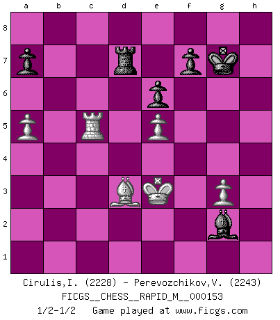 Last move : 1/2-1/2 2024 January 18 16:41:11 [Event "FICGS__CHESS__RAPID_M__000153"] [Site "FICGS"] [Date "2023.12.18"] [Round "1"] [White "Cirulis,Ilmars"] [Black "Perevozchikov,Vjacheslav"] [Result "1/2-1/2"] [WhiteElo "2228"] [BlackElo "2243"] 1.d4 e6 2.Bf4 c5 3.c3 Nc6 4.e3 Nf6 5.Nd2 d5 6.Ngf3 Bd6 7.Bg3 O-O 8.Bd3 b6 9.e4 Be7 10.e5 Nh5 11.Ng5 Bxg5 12.Qxh5 g6 13.Qe2 cxd4 14.h4 Be7 15.h5 dxc3 16.bxc3 d4 17.hxg6 hxg6 18.Ne4 Kg7 19.Qf3 Rh8 20.Rxh8 Qxh8 21.Nd6 Qh1+ 22.Ke2 Qh5 23.Qxh5 gxh5 24.Rc1 h4 25.cxd4 Nxd4+ 26.Ke3 hxg3 27.Kxd4 Bd7 28.fxg3 Rd8 29.Nb7 Bc5+ 30.Nxc5 bxc5+ 31.Ke3 Bc6 32.Rxc5 Bxg2 33.a4 Rd7 34.a5 1/2-1/2 Follow this game move after move (download)Every Pawn is a potential Queen. (James Mason) Die westlichen Werte sind eine Sprache, welche die Putin-Administration nicht versteht. (Garry Kasparov) El jugador táctico sabe que hacer cuando hay algo que hacer; mientras que el estratega sabe que hacer cuando no hay nada que hacer. (Gerald Abrahams) Vouloir jouer aux échecs contre soi-même est aussi paradoxal que vouloir marcher sur son ombre. (Stefan Zweig) Just because you do not take an interest in politics doesn't mean politics won't take an interest in you. (Pericles 430 B.C.)