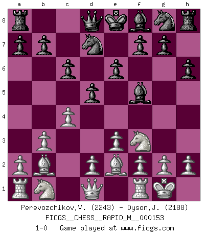 Last move : 1-0 2024 February 6 13:38:12 [Event "FICGS__CHESS__RAPID_M__000153"] [Site "FICGS"] [Date "2023.12.18"] [Round "1"] [White "Perevozchikov,Vjacheslav"] [Black "Dyson,John"] [Result "1-0"] [WhiteElo "2243"] [BlackElo "2188"] 1.Nf3 d5 2.b3 Bf5 3.Bb2 e6 4.e3 Nd7 5.Be2 c6 6.O-O h6 7.c4 1-0 This chess game has been lost on time (started : 2023.12.18 10:19:41) Follow this game move after move (download)By this measure (on the gap between Fischer & his contemporaries), I consider him the greatest world champion. (Garry Kasparov) Wir können eben der zündenden Macht des Opfers nicht wiederstehen, denn die Begeisterung für das Opfer liegt in der Natur des Menschen. (Rudolf Spielmann) El Ajedrez es un juego terrible. Si no dominas el centro, tu oponente tiene una posición mas libre. Si tu tienes el centro, entonces realmente tienes algo de que preocuparte. (Siegbert Tarrasch) Toute estimation doit être constamment réévaluée. (Jacob Estrin) If things go wrong, don't go with them. (Roger Babson)