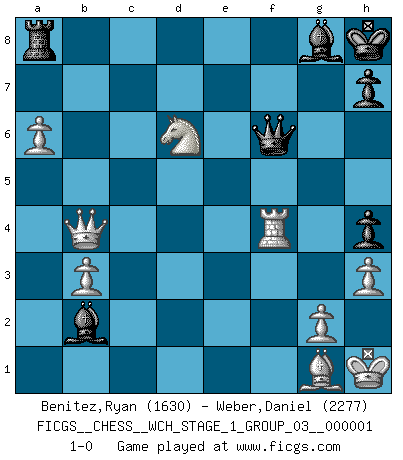 Last move : 1-0 2006 October 1 8:34:10 [Event "FICGS__CHESS__WCH_STAGE_1_GROUP_03__000001"] [Site "FICGS"] [Date "2006.07.01"] [Round "1"] [White "Benitez,Ryan"] [Black "Weber,Daniel"] [Result "1-0"] [WhiteElo "1630"] [BlackElo "2277"] 1.d4 Nf6 2.Nc3 d5 3.Nf3 g6 4.Bf4 Bg7 5.e3 O-O 6.Bd3 c5 7.O-O cxd4 8.exd4 Nc6 9.h3 Nh5 10.Bg5 f6 11.Be3 e5 12.Be2 e4 13.Nd2 f5 14.Bxh5 gxh5 15.Ne2 Ne7 16.Nf4 h4 17.c4 Ng6 18.Rc1 dxc4 19.Nxc4 Nxf4 20.Bxf4 Qxd4 21.b3 b6 22.Qh5 Qf6 23.Nd6 Qg6 24.Qe2 Be6 25.Rfd1 Kh8 26.Rc7 Rg8 27.f3 Rgf8 28.Kh1 Rfd8 29.Qb5 Rg8 30.Qc6 Bf6 31.Rd2 Rgf8 32.Re2 a6 33.fxe4 fxe4 34.Rxe4 Bg8 35.Be3 Bb2 36.Bg1 Rad8 37.Rd4 b5 38.Qc5 Qf6 39.Ra7 a5 40.Rxa5 Be6 41.Rd2 Ba1 42.Ra7 Bg8 43.a4 b4 44.a5 Bc3 45.Rd3 Bb2 46.a6 Qf1 47.Rd4 Qf6 48.Qxb4 Ra8 49.Rxa8 Rxa8 50.Rf4 1-0 Comment by player 1 : Ryan Benitez : Thank you, good game. Comment by player 2 : Daniel Weber : Congratualations, you played a strong game. Queen's pawn game Kingside Castling by player Black (move 5) Kingside Castling by player White (move 7) Player White won this chess game. Follow this game move after move (download)No Chess Grandmaster is normal; they only differ in the extent of their madness. (Viktor Korchnoi) Bis zum Jahr 1971 verlief in meiner Schachkariere alles glatt. Dieses dramatische Match [Fischer-Taimanov 6:0] machte mein Leben zur Hölle. (Mark Taimanov) El Ajedrez es el gimnasio de la mente. (Blaise Pascal) Les échecs sont plus proches de l'art de l'assassinat que de l'art de la guerre. (Arturo Perez-Reverte) Plans are ideas that never come to fruition. (Daniel Parmet)