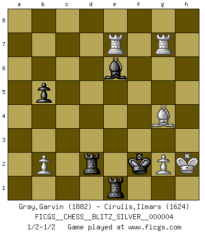 Last move : 1/2-1/2 2007 September 12 16:19:59 [Event "FICGS__CHESS__BLITZ_SILVER__000004"] [Site "FICGS"] [Date "2007.09.12"] [Round "1"] [White "Gray,Garvin"] [Black "Cirulis,Ilmars"] [Result "1/2-1/2"] [WhiteElo "1882"] [BlackElo "1624"] 1.e4 e5 2.Nf3 Nc6 3.Bb5 a6 4.Ba4 Nf6 5.O-O Bc5 6.c3 b5 7.Bc2 d5 8.d4 dxe4 9.Nxe5 Nxe5 10.dxe5 Qxd1 11.Bxd1 Ng4 12.Bf4 e3 13.fxe3 Nxe3 14.Bxe3 Bxe3+ 15.Kh1 Be6 16.a4 Bc4 17.Re1 Bf2 18.Re4 Rd8 19.Na3 Bd3 20.Rf4 Bc5 21.Nc2 O-O 22.Nd4 Bxd4 23.cxd4 g5 24.Rg4 h6 25.h4 Bf5 26.Rg3 Rxd4 27.hxg5 Re8 28.gxh6 Kh7 29.Rg7+ Kxh6 30.Rxf7 Rxe5 31.Bf3 Bd7 32.axb5 axb5 33.Ra6+ Kg5 34.Rg7+ Kf4 35.Rf6+ Ke3 36.R6f7 Be6 37.Rxc7 Rd2 38.Rce7 Kf2 39.Bg4 Re1+ 40.Kh2 1/2-1/2 Ruy Lopez : Moeller defense Kingside Castling by player White (move 5) Kingside Castling by player Black (move 21) This chess game ended in a draw. Follow this game move after move (download)Bobby Fischer is the greatest Chess player who has ever lived. (Ken Smith) Ich würde mich als ganz normalen Jungen bezeichnen [Im Alter von 12]. (Sergej Karjakin) Cuando tengas duda... ¡juega al Ajedrez!. (Tevis) Les Cavaliers se révèlent fort utiles dans les positions fermées. D'habitude, les Fous sont un peu plus forts que les Cavaliers dans les positions ouvertes. Qu'on le veuille ou non, il restera toujours des exceptions ! Always two there are. No more no less. A master, and an apprentice. (Master Yoda in Star Wars ep.1)