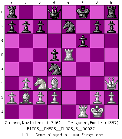 Last move : 1-0 2024 March 1 15:21:30 [Event "FICGS__CHESS__CLASS_B__000371"] [Site "FICGS"] [Date "2023.12.22"] [Round "1"] [White "Suwara,Kazimierz"] [Black "Trigance,Emile"] [Result "1-0"] [WhiteElo "1946"] [BlackElo "1857"] 1.b3 e5 2.Bb2 Nc6 3.e3 d5 4.Bb5 Bd6 5.f4 f6 6.Nh3 Bxh3 7.Qh5+ Kf8 8.Qxh3 exf4 9.exf4 Bxf4 10.O-O Bd6 11.Nc3 Nd4 12.Bd3 Be5 13.Rae1 Ne7 14.Rxe5 1-0 Follow this game move after move (download)Chess is a terrible game. If you have no center, your opponent has a freer position. If you do have a center, then you really have something to worry about ! (Siegbert Tarrasch) Ein guter Spieler hat immer Glück. (José Raúl Capablanca) Me dio la sensación de como si yo estuviera jugando en contra del mismo Ajedrez. - al estar jugando en contra de Robert Fischer (Walter Shipman) Les écrivains ont utilisé les échecs pour analyser les côtés extrêmes de la nature humaine. Dans ce cadre, les échecs offrent un champ d'expérimentation idéal. Mais on pourrait faire la même chose avec la peinture. Et là, en vous référant à Van Gogh, vous ne tirerez pas de conclusion définitive sur les peintres. (Gary Kasparov) Life is like a game of cards: the hand you are dealt represents determinism; the way you play it is free will. (Jawaharlal Nehru)