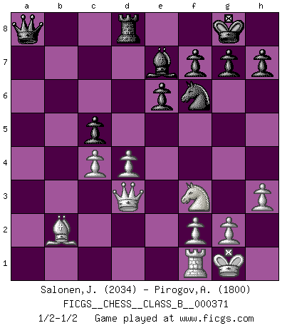 Last move : 1/2-1/2 2024 January 21 8:29:28 [Event "FICGS__CHESS__CLASS_B__000371"] [Site "FICGS"] [Date "2023.12.22"] [Round "1"] [White "Salonen,Jukka"] [Black "Pirogov,Andrey Mikhaylovich"] [Result "1/2-1/2"] [WhiteElo "2034"] [BlackElo "1800"] 1.d4 d5 2.c4 c6 3.Nf3 Nf6 4.Nc3 dxc4 5.a4 Bf5 6.e3 e6 7.Bxc4 Nbd7 8.O-O Bg6 9.a5 b5 10.axb6 axb6 11.Rxa8 Qxa8 12.h3 b5 13.Bd3 Bxd3 14.Qxd3 Be7 15.e4 b4 16.e5 bxc3 17.exf6 Nxf6 18.bxc3 O-O 19.c4 c5 20.Bb2 Rd8 1/2-1/2 Follow this game move after move (download)The Pin is mightier than the sword. (Fred Reinfeld) Auf Remis zu spielen ist gewissermaßen ein Verbrechen gegen das Schachspiel. (Mikhail Nekhemyevich Tal) El Ajedrez se juega con la mente... ¡no con las manos!. (Renaud y Kahn) La vie et les Echecs sont tous les deux une lutte constante. (Lasker) Good luck. You're gonna need it. (Han Solo in Star Wars ep.6)