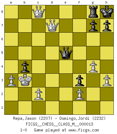 Last move : 1-0 2008 May 5 21:37:57 [Event "FICGS__CHESS__CLASS_M__000013"] [Site "FICGS"] [Date "2007.09.12"] [Round "1"] [White "Repa,Jason"] [Black "Domingo,Jordi"] [Result "1-0"] [WhiteElo "2207"] [BlackElo "2232"] 1.e4 e5 2.Nf3 f5 3.Nxe5 Qf6 4.d4 d6 5.Nc4 fxe4 6.Nc3 Qg6 7.Bf4 Nf6 8.Qd2 Be7 9.O-O-O O-O 10.h3 a6 11.Kb1 b5 12.Na5 Nbd7 13.d5 Ne5 14.a3 Bd7 15.Be2 Rab8 16.g4 Nf3 17.Bxf3 exf3 18.Rde1 Bd8 19.Qd4 Kh8 20.Qa7 b4 21.Qxb8 bxc3 22.Nc6 Bxc6 23.dxc6 Ne4 24.Rxe4 Qxe4 25.Bxd6 Re8 26.Bxc7 Bg5 27.Qb7 cxb2 28.Bb6 Bf6 29.Rd1 Qa4 30.Bc5 Qc4 31.Qd7 Rg8 32.Bd4 Bxd4 33.Rxd4 Qf1+ 34.Kxb2 Qb5+ 35.Rb4 Qe5+ 36.Kb3 a5 37.c7 axb4 38.c8Q 1-0 Latvian counter-gambit Queenside Castling by player White (move 9) Kingside Castling by player Black (move 9) Promotion Queen by player White (move 38) Player White won this chess game. Follow this game move after move (download)Why must I lose to this idiot ? (Aron Nimzovich) Man wirke der falschen Auffassung entgegen, als ob jeder Zug Unmittelbares zu leisten habe; auch Werte- und Ruhezüge haben ihre Existenzberechtigung. (Aaron Nimzowitsch) Hay dos clases de hombres: aquellos que se conforman en dejarse llevar por las circunstancias y que juegan barajas y aquellos decididos a controlar las circunstancias y que juegan al Ajedrez. (Mortimer Collins) L'ordinateur a tué l'originalité. Il n'y a plus guère d'aventures sur l'échiquier. (Jacob Murray) In every real man a child is hidden that wants to play. (Friedrich Nietzsche)
