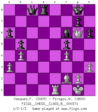 Last move : 1/2-1/2 2024 March 24 13:32:30 [Event "FICGS__CHESS__CLASS_B__000371"] [Site "FICGS"] [Date "2023.12.22"] [Round "1"] [White "Vasquez,Fernando"] [Black "Pirogov,Andrey Mikhaylovich"] [Result "1/2-1/2"] [WhiteElo "2069"] [BlackElo "1800"] 1.e4 c5 2.c3 d5 3.exd5 Qxd5 4.d4 Nf6 5.Nf3 e6 6.Be2 cxd4 7.cxd4 Nc6 8.Nc3 Qd6 9.O-O Be7 10.Nb5 Qd8 11.Bf4 Nd5 12.Bg3 a6 13.Nc3 O-O 14.Rc1 Nf6 15.Bc4 b5 16.d5 exd5 17.Bxd5 Bb7 18.Re1 Rc8 19.a3 h6 20.b4 Re8 21.Re3 Kf8 22.h3 Nxd5 23.Nxd5 Nd4 24.Rxc8 Nxf3+ 25.Qxf3 Qxc8 26.Qe4 Bxd5 27.Qxd5 Rd8 28.Qe4 Bg5 29.f4 f5 30.Qe6 Bf6 31.Bf2 Bb2 32.Qg6 Kg8 33.Re1 Bf6 1/2-1/2 Follow this game move after move (download)Fischer is the strongest player in the world. In fact, the strongest player who ever lived. (Larry Evans) Wie bekannt hörte Morphy 1859 auf, Schach zu spielen. Seine Enttäuschung galt nicht so sehr dem Schach, wie den Schachspielern. (Robert James Fischer) El Ajedrez no es como la vida... ¡tiene reglas!. (Mark Pasternak) Vouloir jouer aux échecs contre soi-même est aussi paradoxal que vouloir marcher sur son ombre. (Stefan Zweig) Watch your thoughts; they become words. Watch your words; they become actions. Watch your actions; they become habits. Watch your habits; they become character. Watch your character; it becomes your destiny. (Frank Outlaw)