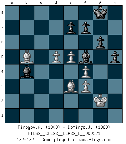 Last move : 1/2-1/2 2024 March 2 23:6:7 [Event "FICGS__CHESS__CLASS_B__000371"] [Site "FICGS"] [Date "2023.12.22"] [Round "1"] [White "Pirogov,Andrey Mikhaylovich"] [Black "Domingo,Jordi"] [Result "1/2-1/2"] [WhiteElo "1800"] [BlackElo "1969"] 1.Nf3 c5 2.c4 Nf6 3.Nc3 d5 4.cxd5 Nxd5 5.d4 Nxc3 6.bxc3 g6 7.e4 Bg7 8.h3 Nc6 9.Be3 Qa5 10.Bd2 O-O 11.Be2 cxd4 12.cxd4 Qa3 13.d5 Ne5 14.O-O Bd7 15.Rb1 Qxa2 16.Rxb7 Rfb8 17.Qb1 Nxf3+ 18.gxf3 Qxb1 19.Rfxb1 Be5 20.Bd3 Bxh3 21.f4 Bd6 22.e5 Rxb7 23.Rxb7 Rb8 24.Rxa7 Bc5 25.Rc7 Rc8 26.Rxc8+ Bxc8 27.Be3 Bb4 28.Bb5 Bf5 29.f3 h5 30.Kg2 1/2-1/2 Follow this game move after move (download)A player surprised is half beaten. (Proverb) Der beste Spieler in einem Turnier gewinnt es nie. Er landet auf Platz zwei oder drei. (Siegbert Tarrasch) ¿Que sería del Ajedrez sin errores graciosos?. (Kurt Richter) Nous sommes les pions de la mystérieuse partie d'Echecs jouée par Dieu. Il nous déplace, nous arrête, nous pousse encore, puis nous lance un à un dans la boîte du Néant. Epitaphe sur la tombe de David Janowsky (1868-1927). The problem with troubleshooting is that trouble shoots back. (Anonymous)
