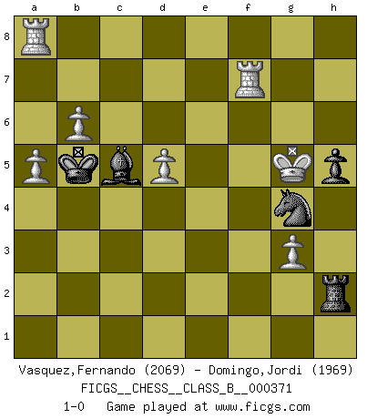 Last move : 1-0 2024 September 3 21:42:32 [Event "FICGS__CHESS__CLASS_B__000371"] [Site "FICGS"] [Date "2023.12.22"] [Round "1"] [White "Vasquez,Fernando"] [Black "Domingo,Jordi"] [Result "1-0"] [WhiteElo "2069"] [BlackElo "1969"] 1.e4 e5 2.Nf3 f5 3.Nxe5 Qf6 4.d4 d6 5.Nc4 fxe4 6.Nc3 Qg6 7.f3 exf3 8.Qxf3 Nc6 9.Nb5 Bg4 10.Qc3 Rc8 11.d5 Ne5 12.Nxa7 Ra8 13.Nxe5 Qe4+ 14.Be3 dxe5 15.Bb5+ Bd7 16.O-O Nf6 17.Bf2 Bd6 18.Rae1 Qb4 19.Rxe5+ Kd8 20.Qxb4 Bxb4 21.Bxd7 Kxd7 22.a3 Bd6 23.Rf5 Rhf8 24.Bd4 Rxa7 25.Bxa7 b6 26.Rg5 Rf7 27.c4 Kc8 28.b4 Kb7 29.c5 Bf8 30.Bxb6 cxb6 31.Rb1 Re7 32.Rf5 Re3 33.a4 Kc8 34.cxb6 Ra3 35.a5 Ra4 36.Rc1+ Kb8 37.Rc7 Bxb4 38.Rxg7 Ng4 39.Rg8+ Kb7 40.Rf7+ Ka6 41.g3 Bc5+ 42.Kh1 Ra1+ 43.Kg2 Ra2+ 44.Kh3 h5 45.Ra8+ Kb5 46.Kh4 Rxh2+ 47.Kg5 1-0 Follow this game move after move (download)In Chess, as it is played by masters, chance is practically eliminated. (Emanuel Lasker) Er war ein guter Schachspieler, aber ich kann Leute nicht ausstehen, die 'Heil Hitler' rufen (Über Alexander Aljechin). (Miguel Najdorf) El Ajedrez es 99 por ciento táctica. (Teichmann) Votre prénom est 'Tactique', votre deuxième prénom est 'Tactique' et votre nom est 'Tactique'. (Ken Smith) I take risks, sometimes patients die, but not taking risks causes more patients to die. So I guess my biggest problem is I've been cursed with the ability to do the math. (Gregory House, House M.D.)