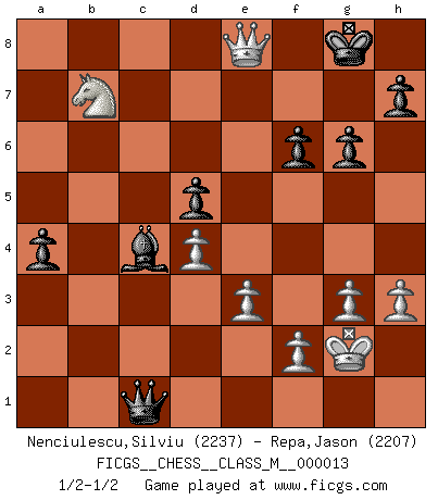 Last move : 1/2-1/2 2008 June 5 21:36:25 [Event "FICGS__CHESS__CLASS_M__000013"] [Site "FICGS"] [Date "2007.09.12"] [Round "1"] [White "Nenciulescu,Silviu"] [Black "Repa,Jason"] [Result "1/2-1/2"] [WhiteElo "2237"] [BlackElo "2207"] 1.d4 Nf6 2.c4 e6 3.Nf3 b6 4.g3 Bb7 5.Bg2 Be7 6.Nc3 Ne4 7.Bd2 Bf6 8.O-O O-O 9.Rc1 d5 10.cxd5 exd5 11.Bf4 Nxc3 12.bxc3 Re8 13.Re1 Nd7 14.Qc2 c5 15.Rcd1 Rc8 16.Qb1 Nf8 17.Be5 Bxe5 18.Nxe5 cxd4 19.cxd4 Ne6 20.e3 f6 21.Nf3 g6 22.Rc1 Qd6 23.Qd3 Kg7 24.Qb3 Red8 25.h3 Rxc1 26.Rxc1 Rc8 27.Rxc8 Bxc8 28.Nd2 Nc7 29.Nb1 Ba6 30.Qc2 Bc4 31.Nd2 b5 32.a4 a5 33.axb5 Bxb5 34.Qc3 a4 35.Qa5 Qc6 36.Nb1 Bc4 37.Qb4 Kf7 38.Nc3 Bb3 39.Bf1 Na6 40.Bxa6 Qxa6 41.Nb5 Qc6 42.Nd6+ Kg7 43.Nb7 Qc1+ 44.Kg2 Bc4 45.Qe7+ Kg8 46.Qe8+ 1/2-1/2 Queen's Indian : Opovcensky variation Kingside Castling by player White (move 8) Kingside Castling by player Black (move 8) This chess game ended in a draw. Follow this game move after move (download)Becoming successful at Chess allows you to discover your own personality. That's what I want for the kids I teach. (Saudin Robovic) Die unerbitterlichsten Regeln im Schach sind die Ausnahmen. (Savielly Grigorievitsch Tartakower) Una clavada es mas poderosa que una espada. (Fred Reinfeld) Même si l'adversaire joue le coup analysé précédemment, recommencez l'analyse en voyant la nouvelle position. Première règle de Blumenfeld Quotation,n.: The act of repeating erroneously the words of another. The words erroneously repeated. (Ambrose Bierce, The Devil's Dictionary)