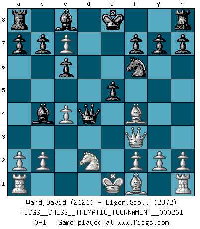 Last move : 0-1 2024 February 4 4:10:1 [Event "FICGS__CHESS__THEMATIC_TOURNAMENT__000261"] [Site "FICGS"] [Date "2023.12.22"] [Round "1"] [White "Ward,David"] [Black "Ligon,Scott"] [Result "0-1"] [WhiteElo "2121"] [BlackElo "2372"] 1.e4 d5 2.exd5 Qxd5 3.Nc3 Qd6 4.d4 Nf6 5.Nf3 Nc6 6.Nb5 Qd8 7.d5 Nb4 8.c4 Na6 9.Bf4 e6 10.d6 c6 11.Nc7+ Nxc7 12.dxc7 Bb4+ 13.Nd2 Qd4 14.Qf3 e5 0-1 Follow this game move after move (download)The combination player thinks forward; he starts from the given position, and tries the forceful moves in his mind. (Emanuel Lasker) Es gibt keine einzige Frau, der ich nicht einen Springer vorgeben könnte und trotzdem gewänne. (Robert James Fischer) Me dio la sensación de como si yo estuviera jugando en contra del mismo Ajedrez. - al estar jugando en contra de Robert Fischer (Walter Shipman) La vie est comme un jeu d'échecs : nous esquissons un plan, mais celui-ci est tributaire de ce que daignent faire l'adversaire aux échecs et le destin dans la vie. (Arthur Schopenhauer) Control your own destiny or someone else will. (Jack Welch)