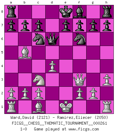 Last move : 1-0 2024 February 2 6:16:55 [Event "FICGS__CHESS__THEMATIC_TOURNAMENT__000261"] [Site "FICGS"] [Date "2023.12.22"] [Round "1"] [White "Ward,David"] [Black "Ramirez,Eliecer"] [Result "1-0"] [WhiteElo "2121"] [BlackElo "2050"] 1.e4 d5 2.exd5 Qxd5 3.Nc3 Qd6 4.d4 Nf6 5.Nf3 Bg4 6.h3 Bxf3 7.Qxf3 Nc6 8.Bb5 1-0 This chess game has been lost on time (started : 2023.12.22 23:0:42) Follow this game move after move (download)Mistrust is the most necessary characteristic of the Chess player. (Siegbert Tarrasch) Ich kenne keine einzige Person, die behaupten würde, Garri Kasparow sei ein guter Mensch (Nigel Short) Un Peón pasado aumenta su poder a medida de que el número de piezas en el tablero disminuye. (Capablanca) Vous n'êtes pas toujours obligé de jouer le meilleur coup. Un coup doit être actif, entreprenant, correct et beau ! (David Bronstein) Nothing is more important for teaching us to understand the concepts we have than constructing fictitious ones. (Ludwig Wittgenstein)
