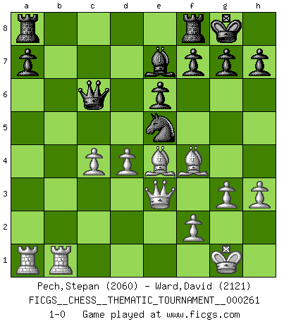 Last move : 1-0 2024 October 5 7:49:31 [Event "FICGS__CHESS__THEMATIC_TOURNAMENT__000261"] [Site "FICGS"] [Date "2023.12.22"] [Round "1"] [White "Pech,Stepan"] [Black "Ward,David"] [Result "1-0"] [WhiteElo "2060"] [BlackElo "2121"] 1.e4 d5 2.exd5 Qxd5 3.Nc3 Qd6 4.d4 Nf6 5.Nf3 c6 6.g3 Bg4 7.Bg2 e6 8.O-O Nbd7 9.Bf4 Qb4 10.a3 Qb6 11.h3 Qxb2 12.Qd2 Bf5 13.Ra2 Qb6 14.Rb1 Qa6 15.Bf1 b5 16.a4 Qc8 17.axb5 Be7 18.bxc6 Qxc6 19.Qe3 O-O 20.Bg2 Nd5 21.Nxd5 Qxd5 22.R2a1 Be4 23.c4 Qc6 24.Ne5 Nxe5 25.Bxe4 1-0 Follow this game move after move (download)After a bad opening, there is hope for the middle game. After a bad middle game, there is hope for the endgame. But once you are in the endgame, the moment of truth has arrived. (Edmar Mednis) Ein Schachspiel besteht aus drei Phasen: Die erste, wenn du hofftst den Vorteil zu haben, die zweite, wenn du glaubst einen Vorteil zu haben, und die dritte.... wenn du weißt Du wirst verlieren. (Savielly Grigorievitsch Tartakower) El Ajedrez es tortura mental. (Garry Kasparov) On peut tirer plus d'utilité d'une partie perdue que de 100 parties gagnées. (Capablanca) If only faces could talk... (Pat Summerall, Sportscaster during the Super Bowl)