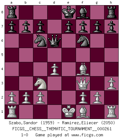 Last move : 1-0 2024 February 2 6:16:55 [Event "FICGS__CHESS__THEMATIC_TOURNAMENT__000261"] [Site "FICGS"] [Date "2023.12.22"] [Round "1"] [White "Szabo,Sandor"] [Black "Ramirez,Eliecer"] [Result "1-0"] [WhiteElo "1959"] [BlackElo "2050"] 1.e4 d5 2.exd5 Qxd5 3.Nc3 Qd6 4.d4 Nf6 5.Nf3 Bg4 6.h3 Bxf3 7.Qxf3 Nc6 8.Bf4 1-0 This chess game has been lost on time (started : 2023.12.22 23:0:42) Follow this game move after move (download)When you play Bobby, it is not a question if you win or lose. It is a question if you survive. (Boris Spassky) Capablanka war das größte Genie der Schachgeschichte! Aber denken sie nicht er habe nichts vom Schach verstanden. Er wusste nur soviel wie er wissen musste um seine Ziele zu erreichen. (Mikhail Moiseyevich Botvinik) Peones: ellos son el alma de esta partida, solos forman el ataque y la defensa. (Philidor) Psychologiquement, tu dois avoir confiance en toi même, mais cette confiance doit être basée sur des faits. (Robert Fischer) Only sick music makes money today. (Friedrich Nietzsche)