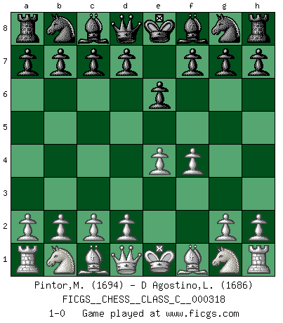 Last move : 1-0 2024 February 10 14:27:8 [Event "FICGS__CHESS__CLASS_C__000318"] [Site "FICGS"] [Date "2023.12.23"] [Round "1"] [White "Pintor,Manuel"] [Black "D Agostino,Leonardo"] [Result "1-0"] [WhiteElo "1694"] [BlackElo "1686"] 1.e4 e6 2.f4 1-0 This chess game has been lost on time (started : 2023.12.23 13:39:22) Follow this game move after move (download)All Chess players should have a hobby. (Savielly Tartakower) Wenn Du einsam bist, wenn Du Dich in der Welt wie ein Fremder fühlst, spiele Schach. Das wird Deinen Geist erheben und Dein Ratgeber im Kampf sein. (Aristoteles) La pasion por jugar al Ajedrez es una de las mas inexplicables en el mundo. (H.G. Wells) On peut tirer plus d'utilité d'une partie perdue que de 100 parties gagnées. (Capablanca) The question of whether computers can think is just like question of whether submarines can swim. (Edsger W. Dijkstra)