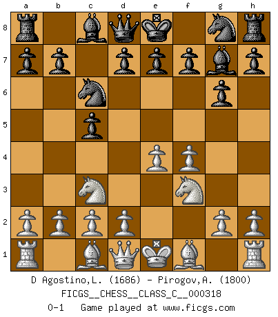 Last move : 0-1 2024 February 11 4:7:12 [Event "FICGS__CHESS__CLASS_C__000318"] [Site "FICGS"] [Date "2023.12.23"] [Round "1"] [White "D Agostino,Leonardo"] [Black "Pirogov,Andrey Mikhaylovich"] [Result "0-1"] [WhiteElo "1686"] [BlackElo "1800"] 1.e4 c5 2.Nc3 Nc6 3.f4 g6 4.Nf3 Bg7 0-1 This chess game has been lost on time (started : 2023.12.23 13:39:22) Follow this game move after move (download)Chess is thirty to forty percent psychology. You don't have this when you play a computer. I can't confuse it. (Judith Polgar) Es gibt nur zwei wahre Schachgenies - das andere war Wilhelm Steinitz, der Weltmeister von 1872 bis 1894. (Robert James Fischer) Bobby Fischer es el jugador de Ajedrez mas grande que jamás haya existido. (Ken Smith) Le pion, dans sa simplicité, marche droit devant lui, mais lorsqu'il prend, il le fait obliquement? Ainsi l'homme, tant qu'il reste pauvre, marche dans la droiture et vit honnêtement, mais lorsqu'il recherche les honneurs, il flatte, se parjure et, par les voies obliques, cherche une position supérieure sur l'échiquier du monde. (Jean de Galles) I'm extremely disappointed. I send you out for exciting, new designer drugs, you come back with tomato sauce. (Gregory House, House M.D.)