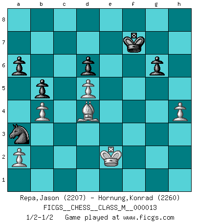 Last move : 1/2-1/2 2008 September 20 11:35:42 [Event "FICGS__CHESS__CLASS_M__000013"] [Site "FICGS"] [Date "2007.09.12"] [Round "1"] [White "Repa,Jason"] [Black "Hornung,Konrad"] [Result "1/2-1/2"] [WhiteElo "2207"] [BlackElo "2260"] 1.e4 c5 2.Nf3 Nc6 3.d4 cxd4 4.Nxd4 Nf6 5.Nc3 e5 6.Ndb5 d6 7.Nd5 Nxd5 8.exd5 Nb8 9.c4 Be7 10.Bd3 O-O 11.O-O a6 12.Nc3 f5 13.f3 Nd7 14.Be3 Bg5 15.Bf2 Qf6 16.Bc2 Qh6 17.h3 b6 18.Rb1 Rb8 19.b4 e4 20.fxe4 Ne5 21.exf5 Nxc4 22.Ne4 Bxf5 23.Nxg5 Qxg5 24.Bxf5 Rxf5 25.Qe2 b5 26.Qe6+ Kh8 27.Bd4 Rbf8 28.Rxf5 Qxf5 29.Re1 Qxe6 30.Rxe6 Kg8 31.Re7 Rf7 32.Re8+ Rf8 33.Rxf8+ Kxf8 34.Kf2 h5 35.Kf3 Kf7 36.Kf4 Kg6 37.g4 hxg4 38.Kxg4 Kf7 39.Kf5 Na3 40.Kf4 Nc2 41.Bc3 Na3 42.Bb2 Nc4 43.Bd4 Na3 44.h4 g6 45.Ke4 Nc4 46.Kd3 Na3 47.Ke2 1/2-1/2 Sicilian : Pelikan (Lasker/Sveshnikov) variation Kingside Castling by player Black (move 10) Kingside Castling by player White (move 11) This chess game ended in a draw. Follow this game move after move (download)One of these modest little moves may be more embarrassing to your opponent than the biggest threat. (Siegbert Tarrasch) Wenn ich einen Club besuche, sind die Spieler stumm vor Staunen. (José Raúl Capablanca) Cuando le juegas a Fischer, no es una cuestion de si vas a ganar o perder. Es una cuestion de si vas a sobrevivir. (Boris Spassky) Je crois qu'il existe des manières très spécifiques de jouer efficacement contre une machine. Evidemment, nous n'avons aucune chance en technique pure, parce que l'ordinateur calcule de manière parfaite. Mais lorsque nous faisons appel à notre cerveau, en utilisant l'intuition et la compréhension, alors nous restons beaucoup plus forts. (Anatoli Karpov) History is the quarrels of popes and kings, with wars or pestilences in every page; the men all so good for nothing, and hardly any women at all. (Jane Austen)
