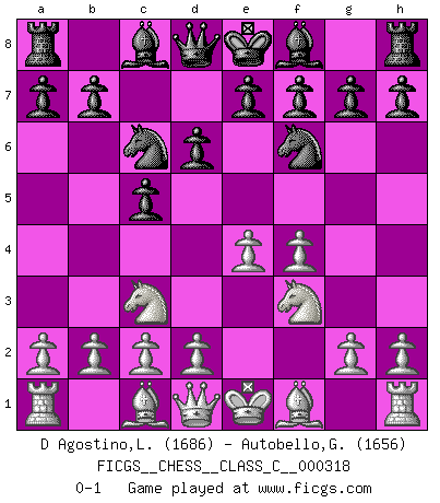 Last move : 0-1 2024 February 13 13:35:1 [Event "FICGS__CHESS__CLASS_C__000318"] [Site "FICGS"] [Date "2023.12.23"] [Round "1"] [White "D Agostino,Leonardo"] [Black "Autobello,Giovanni"] [Result "0-1"] [WhiteElo "1686"] [BlackElo "1656"] 1.e4 c5 2.Nc3 d6 3.f4 Nc6 4.Nf3 Nf6 0-1 This chess game has been lost on time (started : 2023.12.23 13:39:22) Follow this game move after move (download)By the beauty of his games, the clarity of his play, and the brilliance of his ideas, Fischer made himself an artist of the same stature as Brahms, Rembrandt, and Shakespeare. (David Levy) Wer mein Gambit spielt, muß bereit sein, alle Brücken hinter sich abzubrechen. Es verändert den ganzen Menschen. Es wirkt wie ein Zauberstab und fördert verkümmerte, gute Charakter- eigenschaften wieder zu Tage. (Emil Joseph Diemer) La batalla por la última verdad nunca sera ganada. Y es por eso que el Ajedrez es tan fascinante. (Hans Kmoch) Il vaut mieux sacrifier les pièces de l'adversaire. (Xavier Tartacover) Statistics can be made to prove anything - even the truth. (Author unknown)