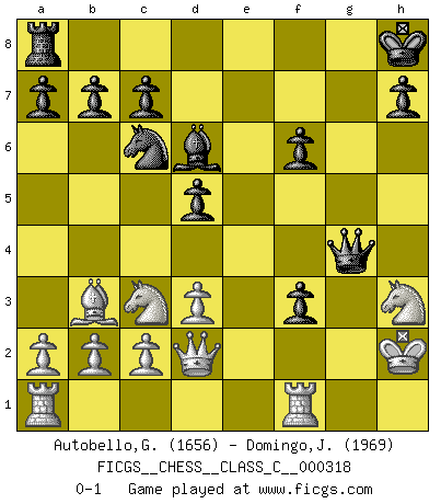 Last move : 0-1 2024 March 29 4:31:33 [Event "FICGS__CHESS__CLASS_C__000318"] [Site "FICGS"] [Date "2023.12.23"] [Round "1"] [White "Autobello,Giovanni"] [Black "Domingo,Jordi"] [Result "0-1"] [WhiteElo "1656"] [BlackElo "1969"] 1.e4 e5 2.Nf3 f5 3.exf5 Bc5 4.Nc3 Nc6 5.Bc4 Nf6 6.O-O d5 7.Bb3 O-O 8.d3 Bxf5 9.Bg5 Be6 10.Bxf6 gxf6 11.h3 Kh8 12.Qd2 Rg8 13.Kh1 Qd7 14.Kh2 Bd6 15.Ng1 Rxg2+ 16.Kxg2 Bxh3+ 17.Nxh3 Qg4+ 18.Kh2 e4 19.f4 exf3 0-1 This chess game has been lost on time (started : 2023.12.23 13:39:22) Follow this game move after move (download)No one ever won a game by resigning. (Unknown) Der Schachmeister von Heute braucht Courage, einen Killerinstinkt, Ausdauer und Arroganz. (Larry Evans) De todos mis libros Rusos, la defensa contiene y difunde el 'calor' mas grande que pudiese verse extraño al observar lo supremamente abstracto que el Ajedrez supuestamente es. (Vladimir Nabokov) Je ne suis pas le dernier à jouer lâchement des coups douteux pendant le zeïtnot de l'adversaire pour l'achever: en effet les coups qui font le plus peur sont ceux que l'on ne comprend pas. Je me fais souvent peur quand je joue. (Un professeur anonyme) Life is like a ten-speed bicycle: most of us have gears we never use. (Charles M. Schulz)