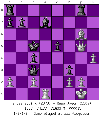 Last move : 1/2-1/2 2007 November 30 2:0:29 [Event "FICGS__CHESS__CLASS_M__000013"] [Site "FICGS"] [Date "2007.09.12"] [Round "1"] [White "Ghysens,Dirk"] [Black "Repa,Jason"] [Result "1/2-1/2"] [WhiteElo "2373"] [BlackElo "2207"] 1.e4 e6 2.d4 d5 3.Nc3 Nf6 4.Bg5 Bb4 5.e5 h6 6.Bd2 Bxc3 7.bxc3 Ne4 8.Qg4 g6 9.Qf4 c5 10.Bd3 Nxd2 11.Qxd2 Qa5 12.Nf3 Nd7 13.h4 c4 14.Be2 Qa3 15.Nh2 f6 16.exf6 Nxf6 17.O-O Bd7 18.Qf4 Rf8 19.Qxh6 Qxc3 20.Qxg6+ Ke7 21.Bh5 Qxd4 22.Nf3 Qc3 23.Qg7+ Kd6 24.Qg3+ e5 25.Bg6 Rg8 26.Rae1 Ne4 27.Rxe4 dxe4 28.Rd1+ Kc5 29.Qg5 exf3 1/2-1/2 French : MacCutcheon, Lasker variation Kingside Castling by player White (move 17) This chess game ended in a draw. Follow this game move after move (download)There are two classes of men; those who are content to yield to circumstances and who play whist; those who aim to control circumstances, and who play Chess. (Mortimer Collins) Was ist der Unterschied zwischen einem Strassenarbeiter und einem Schachspieler? --Der Schachspieler bewegt sich ab und zu. (Anonymous) Todo se encuentra en un estado de flujo y esto incluye al mundo del Ajedrez. (Mikhail Botvinnik) Les Echecs ne sont pas pour les âmes timides. Ils requièrent un homme entier, qui ne s'arrête pas aveuglément à ce qui a été déjà établi, mais qui tente individuellement de sonder les profondeurs du jeu. (W. Steinitz) Chess is as much a mystery as women. (Purdy)