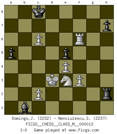 Last move : 1-0 2008 March 10 11:43:0 [Event "FICGS__CHESS__CLASS_M__000013"] [Site "FICGS"] [Date "2007.09.12"] [Round "1"] [White "Domingo,Jordi"] [Black "Nenciulescu,Silviu"] [Result "1-0"] [WhiteElo "2232"] [BlackElo "2237"] 1.e4 c5 2.Nf3 d6 3.d4 cxd4 4.Nxd4 Nf6 5.Nc3 a6 6.Be3 e5 7.Nb3 Be6 8.f3 Be7 9.Qd2 O-O 10.O-O-O Nbd7 11.g4 Nb6 12.Na5 d5 13.g5 d4 14.gxf6 Bxf6 15.Rg1 Qc7 16.Bg5 Bxg5 17.Qxg5 f6 18.Qd2 dxc3 19.Qxc3 Qxc3 20.bxc3 Bxa2 21.Rd6 Na4 22.Nxb7 a5 23.Kd2 Rf7 24.Bb5 Nb2 25.Nc5 Kf8 26.Kc1 Nc4 27.Rc6 Rb8 28.Ne6+ Ke7 29.Bxc4 Bxc4 30.Nxg7 Ba2 31.Kd2 Ra8 32.Nf5+ Kd7 33.Rd6+ Kc7 34.Kd3 Rb8 35.Ra1 Rb1 36.Rxb1 Bxb1 37.c4 Rg7 38.Rxf6 Rg2 39.Ne3 Rxh2 40.c5 Kc8 41.c6 1-0 Sicilian : Najdorf, Byrne (English) attack Kingside Castling by player Black (move 9) Queenside Castling by player White (move 10) Player White won this chess game. Follow this game move after move (download)Chess is ruthless: you've got to be prepared to kill people. (Nigel Short) Sitze auf Deine Hände. (Siegbert Tarrasch) Un Peón pasado aumenta su poder a medida de que el número de piezas en el tablero disminuye. (Capablanca) Aux échecs, l'amour-propre est satisfait quand on remporte la victoire, mais il n'y a pas de honte à être battu. (Benjamin Franklin) A woman without a man is like a fish without a bicycle. (Gloria Steinem)