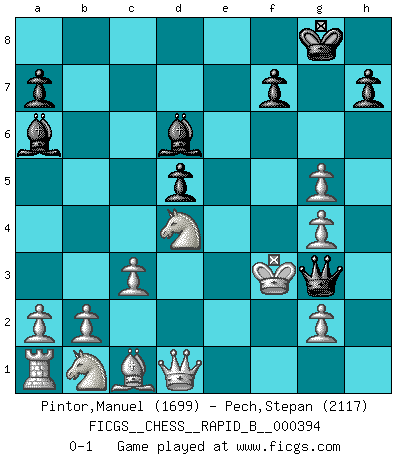 Last move : 0-1 2024 April 4 2:7:39 [Event "FICGS__CHESS__RAPID_B__000394"] [Site "FICGS"] [Date "2024.01.03"] [Round "1"] [White "Pintor,Manuel"] [Black "Pech,Stepan"] [Result "0-1"] [WhiteElo "1699"] [BlackElo "2117"] 1.e4 e6 2.f4 d5 3.exd5 exd5 4.d4 Nf6 5.Nf3 Be7 6.Bd3 c5 7.Bb5+ Nc6 8.O-O cxd4 9.Nxd4 O-O 10.Bxc6 bxc6 11.Nxc6 Qb6+ 12.Nd4 Bc5 13.c3 Ba6 14.Re1 Rfe8 15.Rxe8+ Rxe8 16.h3 Re2 17.Kh2 Ng4+ 18.hxg4 Qh6+ 19.Kg3 g5 20.fxg5 Bd6+ 21.Kf3 Rf2+ 22.Kxf2 Qh4+ 23.Kf3 Qg3+ 0-1 Follow this game move after move (download)The most powerful weapon in Chess is to have the next move. (David Bronstein) Das Zentrum ist der Balkan des Schachbretts - Kriegshandlungen können in jedem Moment ausbrechen. (Aaron Nimzowitsch) El Ajedrez es un cuento de Hadas de las 1001 metidas de pata. (Savielly Tartakower) Il s'avisa de me proposer d'apprendre les échecs qu'il jouait un peu... me voilà forcené des échecs. J'achète un échiquier, je m'enferme dans ma chambre, j'y passe des jours et des nuits à vouloir apprendre par cur toutes les parties. (Jean-Jacques Rousseau, Confessions) The meaning of life is that it is to be lived, and it is not to be traded and conceptualized and squeezed into a pattern of systems. (Bruce Lee)