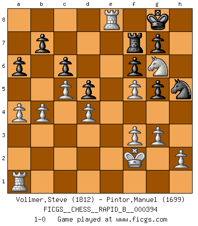 Last move : 1-0 2024 January 13 20:22:44 [Event "FICGS__CHESS__RAPID_B__000394"] [Site "FICGS"] [Date "2024.01.03"] [Round "1"] [White "Vollmer,Steve"] [Black "Pintor,Manuel"] [Result "1-0"] [WhiteElo "1812"] [BlackElo "1699"] 1.d4 d5 2.c4 c6 3.Nf3 Bf5 4.Nc3 e6 5.e3 Bb4 6.Bd3 Bxd3 7.Qxd3 Nf6 8.O-O O-O 9.a3 Bxc3 10.Qxc3 Ne4 11.Qc2 Qf6 12.b4 Qg6 13.c5 Nd7 14.a4 Ndf6 15.Ne5 Qf5 16.f3 Ng5 17.Qxf5 exf5 18.e4 h6 19.Bxg5 hxg5 20.exf5 a6 21.Rfe1 Rae8 22.Kf2 Nh5 23.g3 f6 24.Ng6 Rf7 25.Rxe8+ 1-0 Follow this game move after move (download)If a ruler does not understand Chess, how can he rule over a kingdom ? (King Khusros II) Pläne sind die Träume des Verständigen. (Ernst Freiherr von Feuchtersleben) Yo tuve un dolor de muelas en la primer partida. En el segundo juego, tuve un dolor de cabeza. En el tercero, tuve un ataque de reumatísmo. En la cuarta partida, no me sentía muy bien. ¿Y en el quinto juego? Bueno, ¿que acaso uno tiene que ganar todos los juegos?. (Siegbert Tarrasch) D'abord les bases : Jouez et étudiez, puis étudiez et jouez, ensuite jouez et étudiez, puis étudiez et jouez. Deuxièmement : Donnez toujours le meilleur de vous-même ! (Ken Smith) When you don't know what to do, walk fast and look worried. (Anonymous)