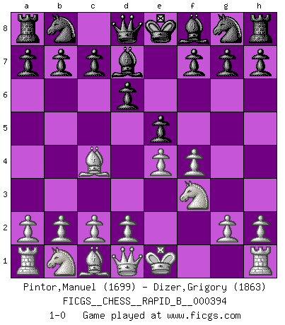 Last move : 1-0 2024 February 7 5:5:5 [Event "FICGS__CHESS__RAPID_B__000394"] [Site "FICGS"] [Date "2024.01.03"] [Round "1"] [White "Pintor,Manuel"] [Black "Dizer,Grigory"] [Result "1-0"] [WhiteElo "1699"] [BlackElo "1863"] 1.e4 e5 2.f4 d6 3.Nf3 Bd7 4.Bc4 1-0 This chess game has been lost on time (started : 2024.01.03 15:13:28) Follow this game move after move (download)Botvinnik tried to take the mystery out of Chess, always relating it to situations in ordinary life. He used to call Chess a typical inexact problem similar to those which people are always having to solve in everyday life. (Garry Kasparov) Ein Schachgenie ist jemand der verdammt gut Schach spielt. (Jonathan Levitt) Hoy en día, si tu no eres un Gran Maestro a los 14 años, es mejor que lo olvides. (Anand Viswanathan) Les échecs sont un jeu par leur forme, un art par leur essence et une science par sa difficulté d'acquisition. Ils peuvent vous procurer autant de plaisir qu'un bon livre ou une belle musique, mais vous n'aurez une réelle joie que si vous arrivez à bien jouer. (Tigran Petrosian) Don't be discouraged. It's often the last key in the bunch that opens the lock. (Author unknown)