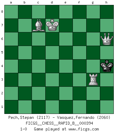 Last move : 1-0 2024 October 20 22:46:56 [Event "FICGS__CHESS__RAPID_B__000394"] [Site "FICGS"] [Date "2024.01.03"] [Round "1"] [White "Pech,Stepan"] [Black "Vasquez,Fernando"] [Result "1-0"] [WhiteElo "2117"] [BlackElo "2060"] 1.d4 Nf6 2.c4 g6 3.Nc3 Bg7 4.e4 d6 5.Nf3 O-O 6.Be2 e5 7.dxe5 dxe5 8.Qxd8 Rxd8 9.Bg5 Re8 10.Nd5 Nxd5 11.cxd5 c6 12.Bc4 cxd5 13.Bxd5 Nd7 14.Nd2 Nc5 15.O-O-O Be6 16.Bxe6 Nxe6 17.Be3 f5 18.f3 f4 19.Bf2 Rac8+ 20.Kb1 b6 21.Nb3 Red8 22.Rxd8+ Rxd8 23.Kc1 Rc8+ 24.Kb1 Rd8 25.Kc1 Bf8 26.Rd1 Bd6 27.a4 Kf7 28.a5 Rc8+ 29.Kb1 Rc6 30.axb6 axb6 31.Nc1 h5 32.Nd3 g5 33.Be1 Kf6 34.Bc3 b5 35.h3 Nc7 36.Ka2 Ne6 37.Kb3 Rb6 38.Rh1 b4 39.Nxb4 Nd4+ 40.Kc4 Bxb4 41.Bxb4 Nc2 42.Bc3 Ne3+ 43.Kc5 Rb3 44.Ra1 Nxg2 45.Ra6+ Kf7 46.Kc4 Rb8 47.Bxe5 Rc8+ 48.Kd3 Nh4 49.Bc3 Nxf3 50.e5 Kg7 51.Ke4 Ng1 52.e6 Kg6 53.Ra7 Ne2 54.Rg7+ Kh6 55.Be5 Re8 56.Kd5 f3 57.Rf7 g4 58.hxg4 hxg4 59.Kd6 g3 60.Kd7 g2 61.Bh2 Ra8 62.e7 Ra7+ 63.Kd6 Ra6+ 64.Ke5 Ra5+ 65.Ke4 Ra8 66.Rf8 f2 67.Rxf2 Re8 68.Rxe2 Rxe7+ 69.Kf3 Rf7+ 70.Kxg2 Kg6 71.Be5 Re7 72.Kf3 Kf5 73.Bc3 Rc7 74.Re5+ Kg6 75.Ke3 Kf7 76.Kd3 Rd7+ 77.Kc4 Rc7+ 78.Rc5 Rb7 79.b4 Ke6 80.b5 Rb8 81.Be5 Ra8 82.b6 Ra4+ 83.Kb5 Ra3 84.b7 Rb3+ 85.Kc6 Kf5 86.Bc7 Ke4 87.Bb6 Rf3 88.b8Q Rf6+ 89.Kd7 Kf3 90.Rc3+ Ke4 91.Qe8+ Kf4 92.Bc7+ Kg4 93.Rg3+ Kh4 94.Qh8+ Rh6 95.Qxh6+ 1-0 Follow this game move after move (download)You are for me the Queen on d8 and I am the Pawn on d7 !! (Eduard Gufeld) Kombinieren und Schwarzhandel gehören verboten. (Savielly Grigorievitsch Tartakower) Una victoria por una combinación errónea, aunque sea espectacular, me llena de horror artístico. (Wilhelm Steinitz) Si rien de grave n'est détecté lors de l'analyse d'une position, on joue alors le coup. Seconde règle de Blumenfeld. If you are going through hell, keep going. (Winston Churchill)