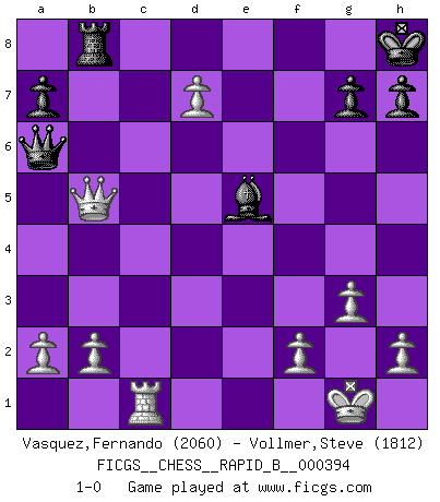 Last move : 1-0 2024 March 10 11:20:59 [Event "FICGS__CHESS__RAPID_B__000394"] [Site "FICGS"] [Date "2024.01.03"] [Round "1"] [White "Vasquez,Fernando"] [Black "Vollmer,Steve"] [Result "1-0"] [WhiteElo "2060"] [BlackElo "1812"] 1.e4 c5 2.c3 e5 3.Nf3 Nc6 4.Bc4 Be7 5.O-O Nf6 6.d4 cxd4 7.cxd4 Qc7 8.dxe5 Nxe5 9.Nxe5 Qxe5 10.Nc3 O-O 11.g3 Qc5 12.Nd5 Nxd5 13.Bxd5 d6 14.Be3 Qa5 15.Bd4 Rb8 16.Rc1 Be6 17.Bxe6 fxe6 18.Qb3 d5 19.Rfd1 Rfd8 20.Be5 Bd6 21.Bc3 Qa6 22.exd5 e5 23.Re1 Re8 24.Re4 Re7 25.Bxe5 Rxe5 26.Rxe5 Bxe5 27.d6 Kh8 28.d7 b5 29.Qxb5 1-0 Follow this game move after move (download)When you are lonely, when you feel yourself an alien in the world, play Chess. This will raise your spirits and be your counselor in war. (Aristotle) Schach ist wie eine schöne Frau, zu der wir ständig zurückkehren, gleichviel, wie oft sie uns zurückweist. (Anonymous) Un juego de Ajedrez es un dialogo, una conversación entre un jugador y su oponente. Cada movimiento del oponente puede contener amenazas o tropiezos, pero un jugador no se puede defender de las amenazas o tomar ventaja de los tropiezos si es que no se pregunta a sí mismo: ¿Que es lo que mi oponente va a hacer después de cada movida?. (Bruce A. Moon) Plusieurs personnes se sont demandées comment Tal faisait pour gagner... En fait, c'est très simple ! Il met ses pièces au centre de l'échiquier et les sacrifie quelque part ! (David Bronstein) Memory is a crazy woman that hoards colored rags and throws away food. (Austin O'Malley)